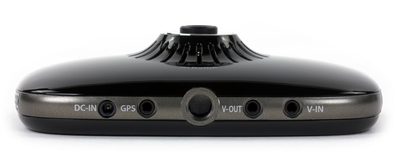 Все разъемы (DC-In, GPS, V-Out, V-In) расположены на верхней грани устройства, по два с каждой стороны от отверстия для установки кронштейна. Выбор весьма неудачный, так как все штекеры, поставляемые в комплекте угловые, а расстояние между разъемами не позволяет поместить их в одну линию.
