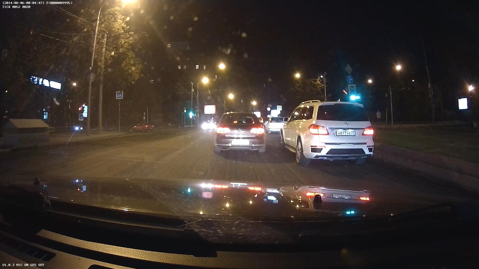 В ночное время, текст на неподсвеченных информационных табло прочитать уже значительно сложнее. Ярко освещенные улицы дают хорошее освещение, но номерные знаки автомобилей уже читаются с большим трудом и только с близкого расстояния. Опять же засвет номера впереди идущего авто от ближнего света автомобиля с видеорегистратором сводит на нет общее качество изображения. Тыловая камера выдает вполне удовлетворительную картинку, хотя многие автомобили с плохо отстроенными фарами создают весьма сильный засвет, и камера на какой-то момент времени слепнет.