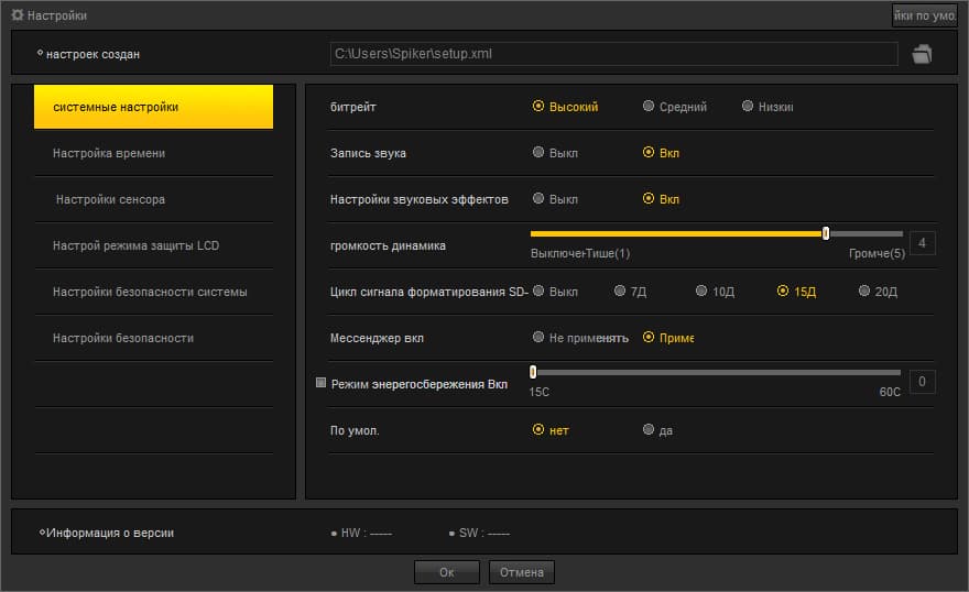 Стоит отметить, что Iroad Ione-T35 Viewer поддерживает сохранение и настройку параметров видеорегистратора, для чего в нем есть отдельное меню «Настройки». По сравнению с меню настроек, которое доступно при работе с сенсорным экраном, здесь пользователь может найти ряд дополнительных настроек. Так, например, можно выставить битрейт записи, громкость динамика, отключить LED-индикацию каждого из светодиодов или задать частоту их мерцания. В остальном настройки дублируют основное меню видеорегистратора. Установленные параметры сохраняются в отдельный файл setup.xml, который затем может быть перенесен на карту памяти.