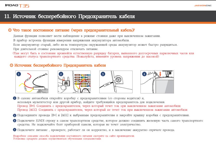 Несмотря на довольно «промтовый» язык инструкции, понять алгоритм действий можно. Порядок здесь такой — один кабель питания (B+) подключаем к предохранителю под напряжением при выключенном зажигании, а другой (ACC) к предохранителю, неактивном при отключенном зажигании. Оставшийся кабель (GND) должен быть подключен к корпусу авто. Таким образом, видеорегистратор сможет определять, стоит ли автомобиль на стоянке или же находится в заведенном состоянии и в зависимости от условий активировать режим «паркинга». Стоит отметить, что Iroad Ione-T35 имеет встроенную защиту от разрядки аккумулятора автомобиля и автоматически выключается при понижении напряжения бортовой сети. Диапазон напряжения для включения и выключения пользователь может выставить в настройках меню, там же можно и выставить рабочее напряжение — 12 или 24 В.