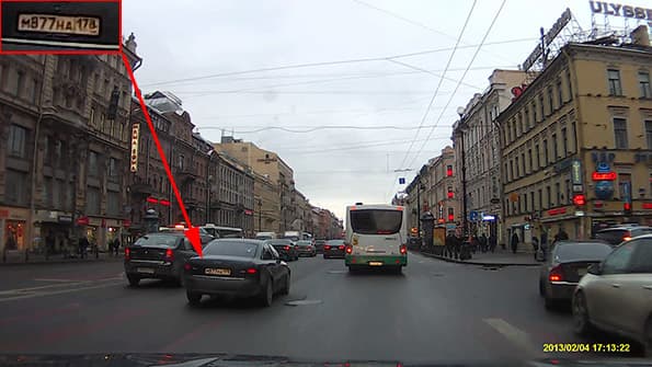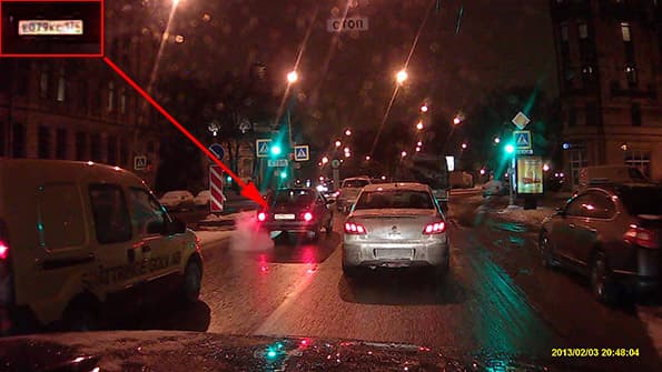 Наш любимый тест — номер автомобиля — регистратор проходил в условиях пасмурного дня, близко к вечеру (время на видеозаписи истинное), то есть не самых комфортных. Тем не менее, разборчивость номера можно оценить как достаточно высокую: приведенные ниже стоп-кадры относятся к движущимся автомобилям, находящимся на расстоянии порядка 10 метров.