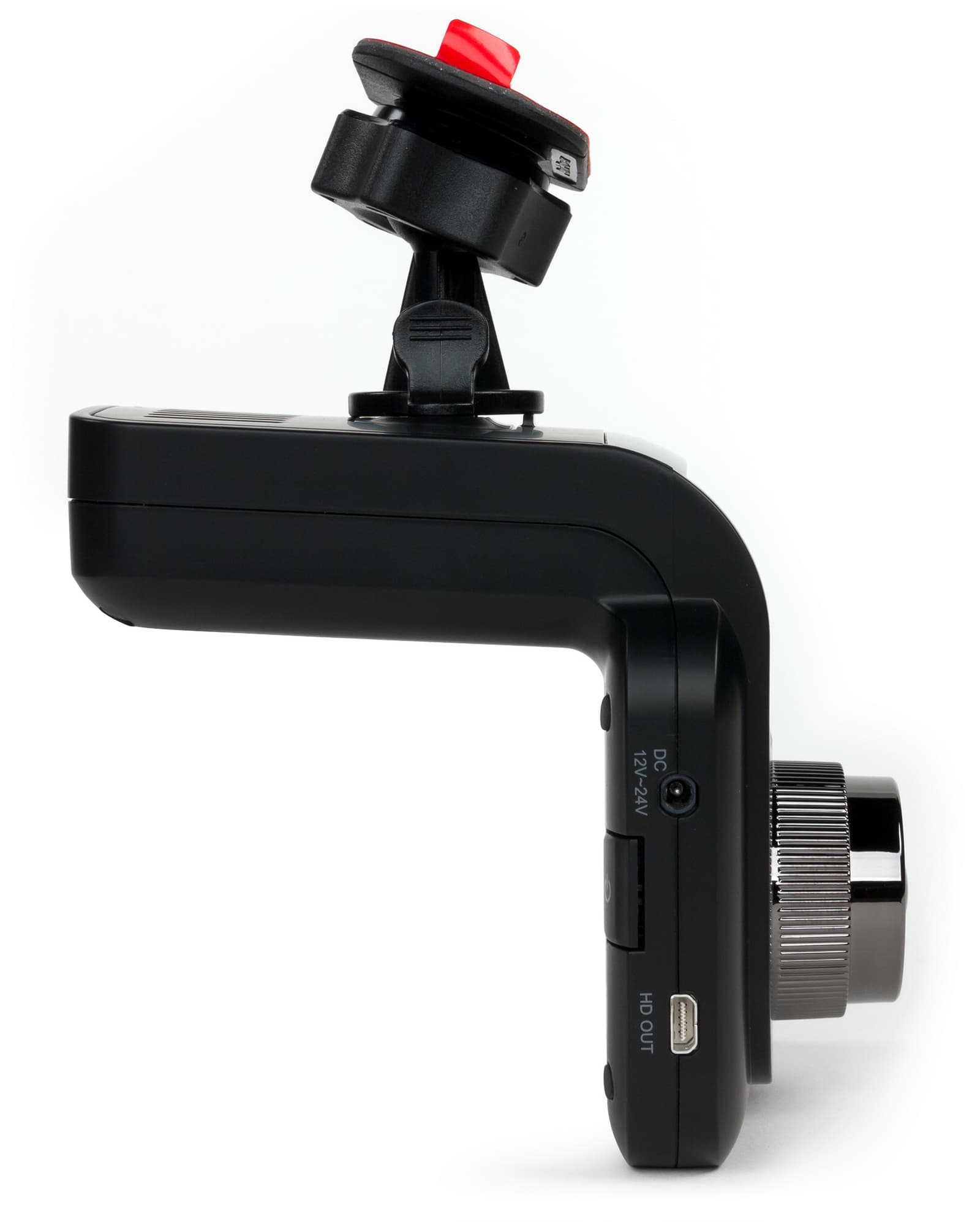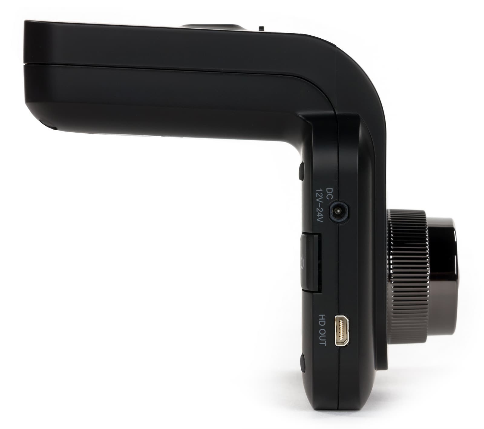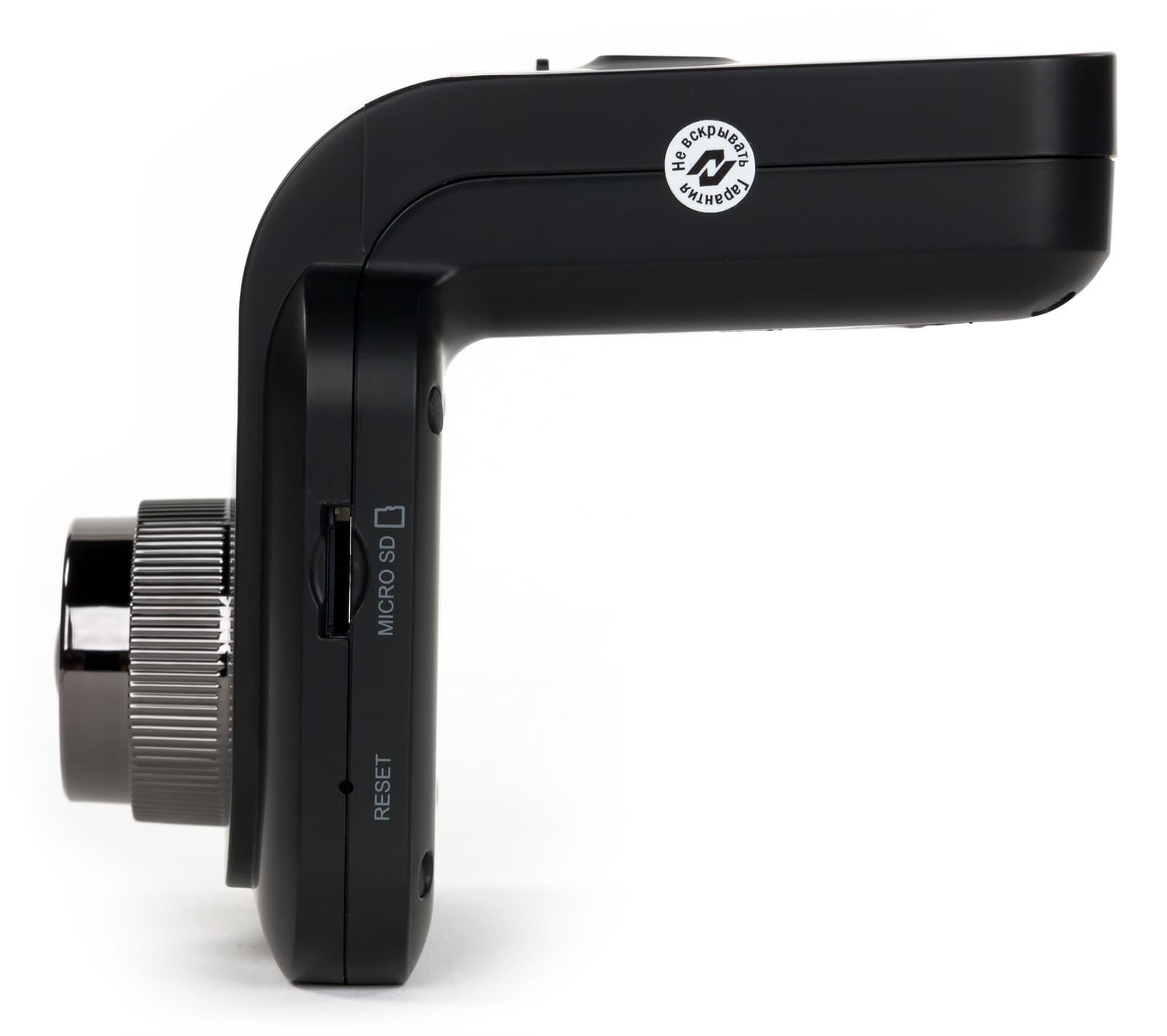 В отличие от многих видеорегистраторов, Neoline X-Cop 9500s имеет собственный разъем для подключения питания, выполненный в виде круглого штекера. Угловой штекер надежно закрепляется внутри модели (при установке можно услышать характерный щелчок), поэтому случайно вытащить его не удастся. Neoline X-Cop 9500s может быть подключен к автомобилям с напряжением бортовой сети 12 или 24 В. Под разъемом питания на правой боковой грани, расположен видеовыход Micro-HDMI (Type D). На противоположной стороне находятся утопленная кнопка Reset для сброса на заводские настройки и слот для карты памяти microSD.