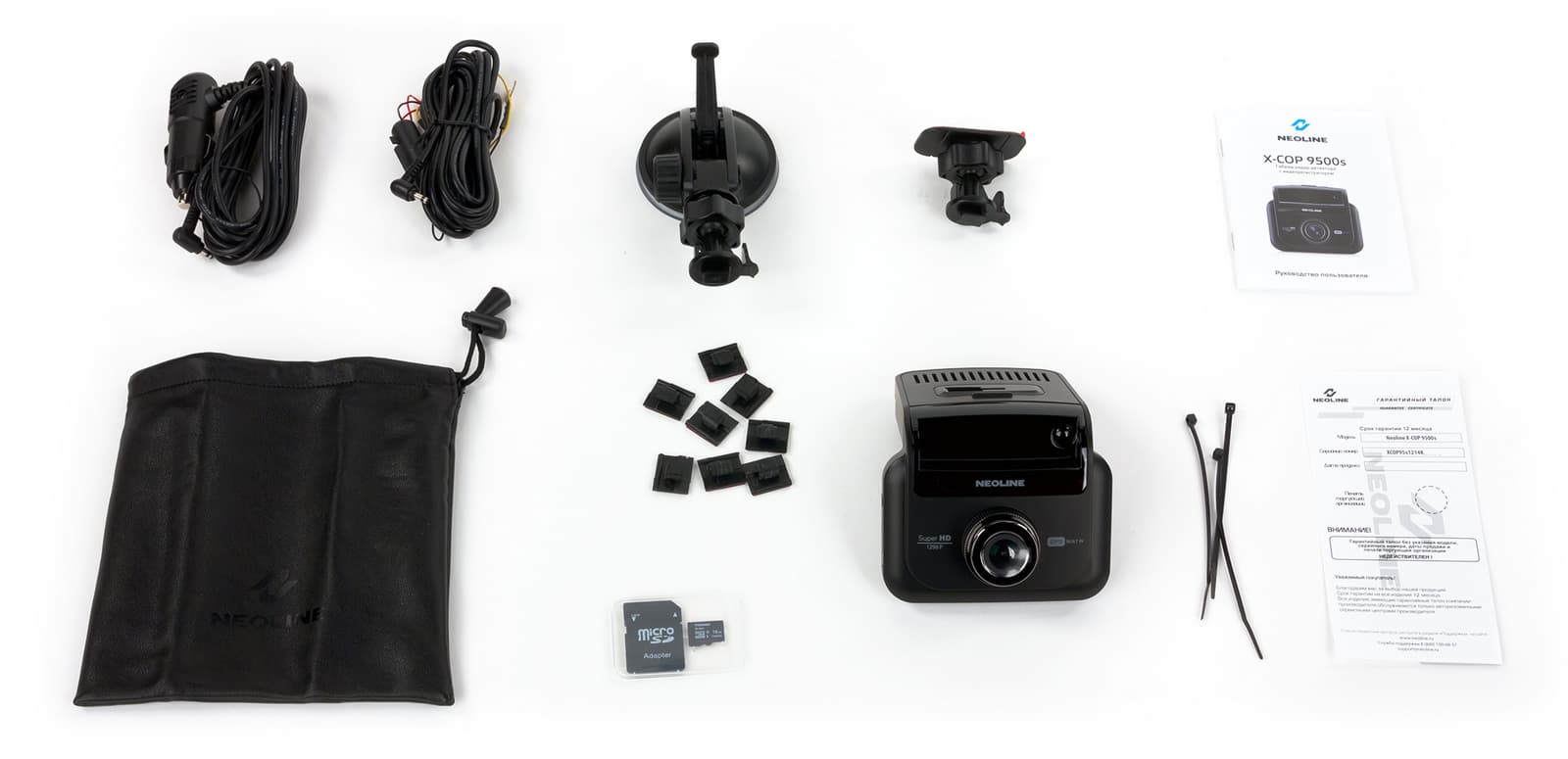 Комплектация Neoline X-Cop 9500s под стать любому премиальному продукту. Дополнительный набор крепежных элементов позволит удобно провести кабель по салону автомобиля, а два типа крепления позволят выбрать оптимальную систему крепления. Также здесь можно найти чехол для хранения, что весьма сподручно, так как скорее всего такую модель держать на лобовом стекле можно только на хорошо охраняемой стоянке. Младшая модель Neoline X-Cop 9500 комплектуется картой памяти объемом 8 Гбайт, но поскольку Neoline X-Cop 9500s позволяет записывать видео с разрешением 2304×1296 (Super HD), ей конечно требуется больше места для хранения данных. Стоит сказать, что идущая в комплекте карта памяти стандарта SDHC объемом 16 Гбайт имеет весьма неплохие скоростные характеристики, правда даже такого объема хватит на запись лишь одного дня пути. Neoline X-Cop 9500s поддерживает установку карт памяти с максимальным объемом 64 Гбайт. Поскольку данный видеорегистратор поддерживает вывод изображения на внешний экран с помощью интерфейса HDMI, при необходимости к нему можно докупить соответствующий кабель с весьма специфическим разъемом Micro-HDMI (Type D). Нельзя обойти вниманием тот факт, что на официальном сайте среди интерфейсов подключения отмечен Mini-USB, хотя в реальности такого порта и кабеля к нему в этом видеорегистраторе нет.