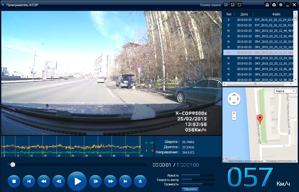 После выбора папки будет выведен список всех видеозаписей в правой части утилиты, а при клике на любом из них начнется воспроизведение. Каждый из представленных видео содержит в себе 1-, 2-, 3- или 5-минутную (в зависимости от настройки) запись с камеры видеорегистратора. Кроме собственно воспроизведения, с возможностью увеличения и уменьшения скорости воспроизведения, X-Cop Viewer выводит посекундный график датчика удара. Под списком видеозаписей можно увидеть текущее местоположение автомобиля, которое определяется в том случае, если GPS/Глонасс-модуль видеорегистратора был активен при записи. Увы, утилита не показывает пройденный путь, но возможно в будущих версиях этой программы эта возможность будет реализована. X-Cop Viewer работает только с картами Google и для пользователя есть выбор отображения карты — схема или спутник. Кроме того, при воспроизведении записанных роликов выводятся текущие координаты и направление движения, а пользователь в реальном времени может видеть текущую скорость автомобиля и регулировать настройки изображения (яркость, контраст).