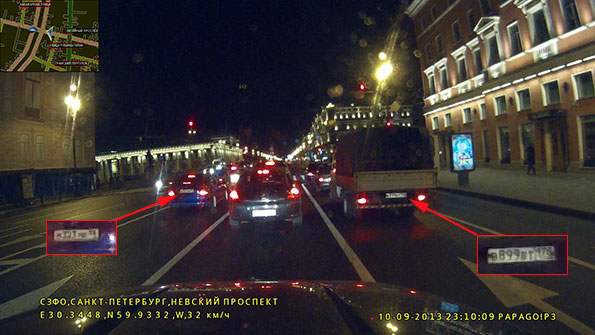 Что ж — ночью, как это часто случается, «труба пониже и дым пожиже». Однако все не так плохо: даже в этих условиях все участники движения хорошо различимы и вполне опознаваемы, и даже номера автомобилей иногда удается определить.