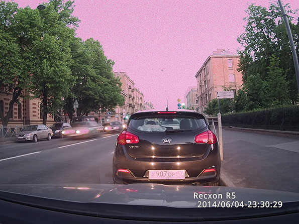 Это, нужно отметить, практически лучшее, на что способен Recxon R5 ночью. Машина недаром стоит сильно сбоку — иначе засветка от фар превратила бы номерной знак в ровный белый прямоугольник. И стоит она тоже недаром — на более высокой скорости будет опять ничего не разобрать. Еще полтора-два года назад мы бы ограничились комментарием «ничего выдающегося, но так оно практически у всех», но сейчас появилось довольно много видеорегистраторов, которые демонстрируют существенно более высокое качество ночного видеоряда.