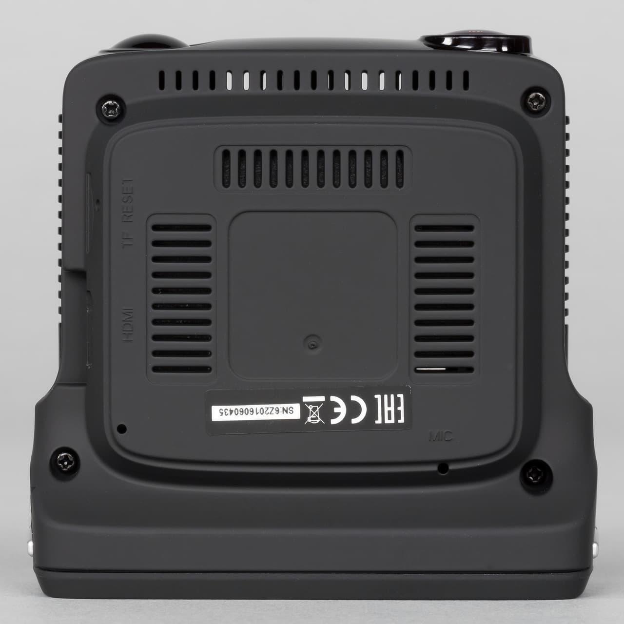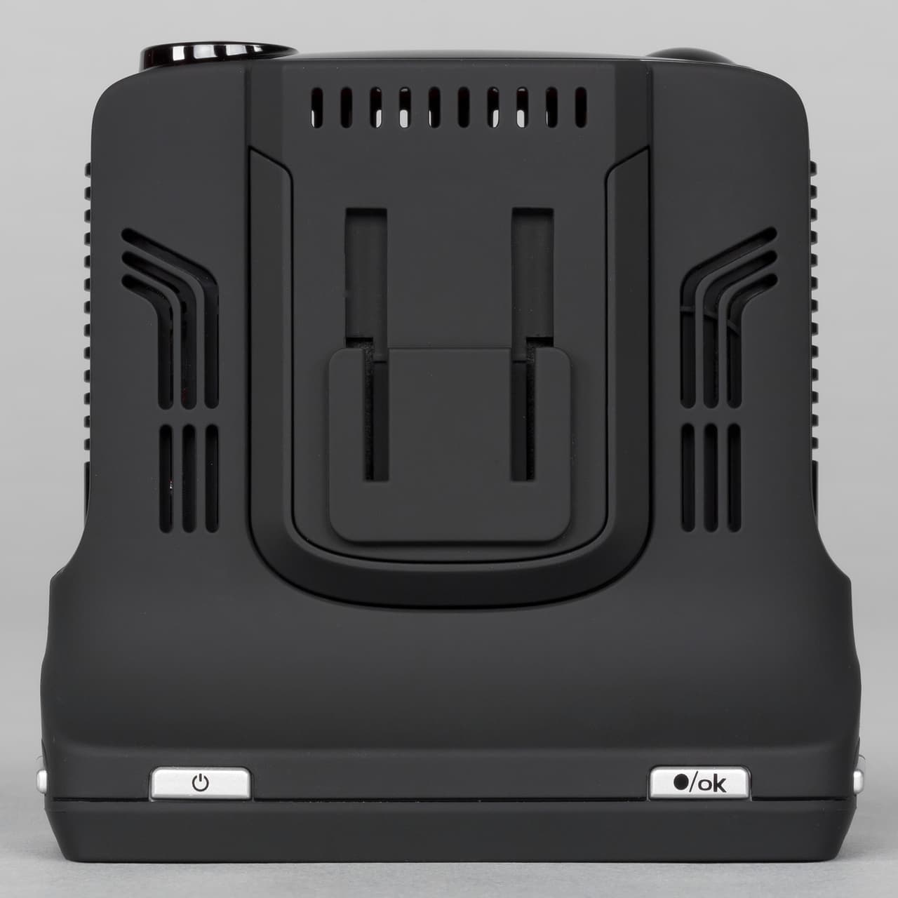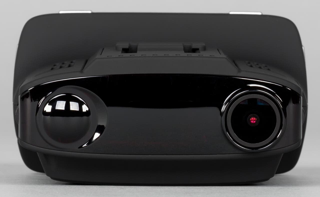 На обращенном в сторону дороги торце установлены сенсоры радар-детектора и объектив камеры. Последний имеет явно выпуклую форму, но риск повреждений снижен благодаря использованию стекла. В отличие от младшей модели, закрывающий эти элементы полупрозрачный пластик заходит на боковые стороны, что делает черный корпус менее лаконичным.