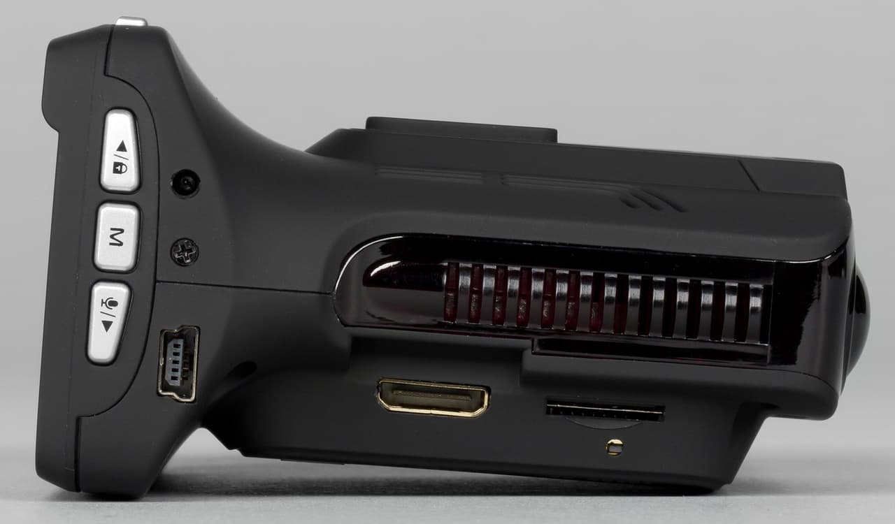 Всего на корпусе видеорегистратора есть восемь кнопок. В данной модели, в отличие от предыдущей, все функции устройства реализованы на одном экране — можно одновременно видеть и картинку с камеры и оповещения радар-детектора. По три кнопки расположено на боковых сторонах слева и справа от экрана и еще две на верхней его кромке. Пользоваться кнопками достаточно удобно — они крупные, хорошо видны на корпусе, нажимаются с характерным щелчком. Трудности может вызвать только запоминание их предназначения, но можно попробовать связать его с обозначениями на кнопках.