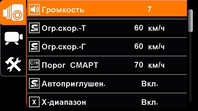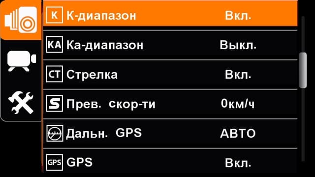 При навигации в меню настроек, которое можно вызвать только при остановленной записи, используются четыре кнопки в правой части — верхняя работает как выбор/подтверждения, вверх/вниз — навигация, «Меню» — вход в меню, выбор группы параметров, выход из меню. Всего в меню есть три раздела. Первый отвечает за работу радар-детектора, второй — за видеорегистратор, в третьем собраны системные параметры.