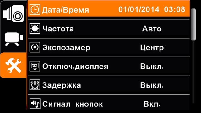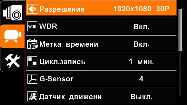 Меню с настройками видеорегистратора не очень большое, но наиболее распространенные параметры здесь присутствуют:
