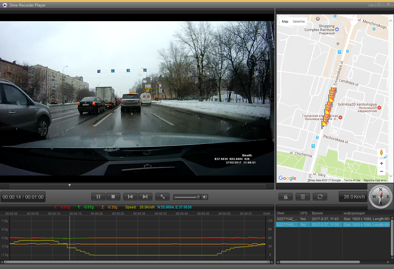 Окно программы имеет плавающие размеры, можно открыть его и на полный экран. Всего на нем можно увидеть четыре поля — видео, карта, данные о скорости/ускорении и список файлов. Состав полей фиксированный, нельзя отключить, например, показ карты. Можно только в небольших пределах двигать вертикальную границу между полями.