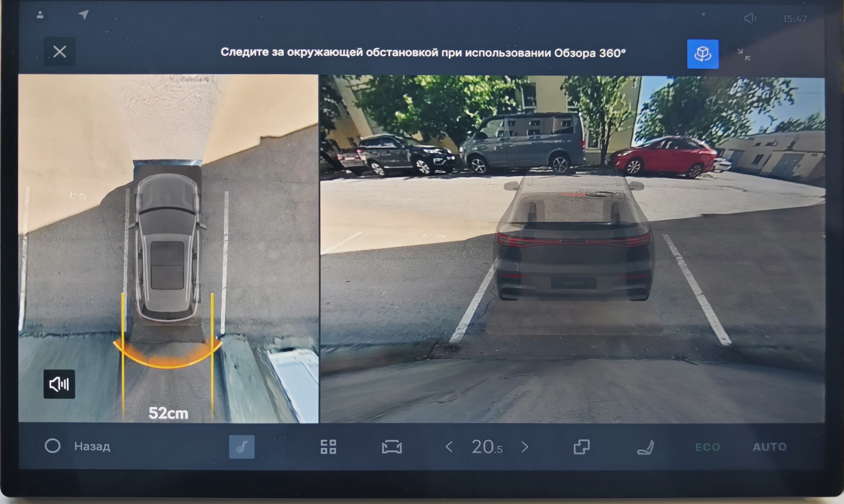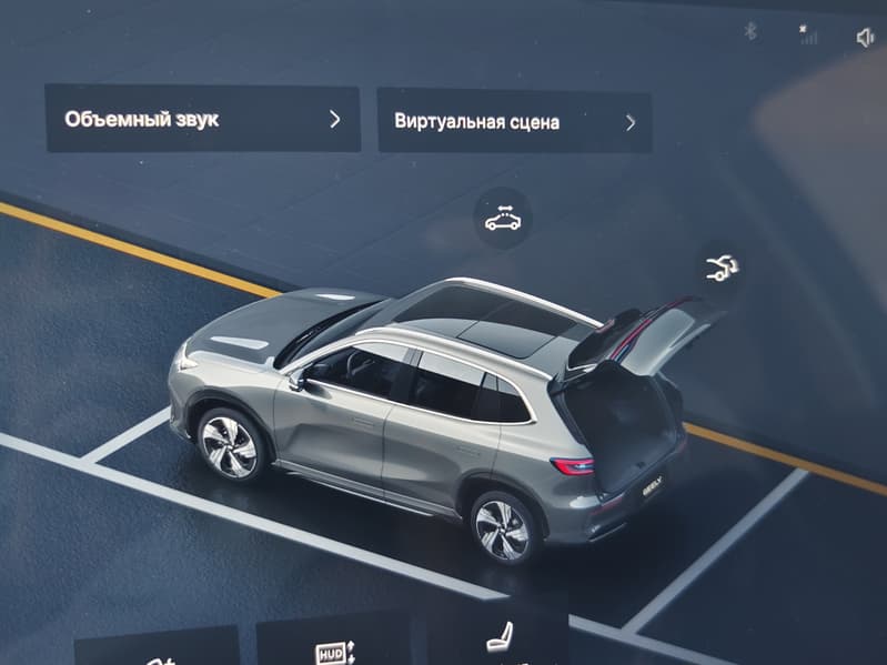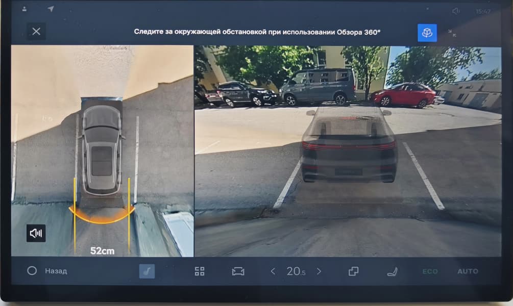 Geely EX5 оснащён системой кругового обзора 360°, которая включает несколько камер для обеспечения обзора вокруг автомобиля, помощи при парковке и работы систем безопасности.