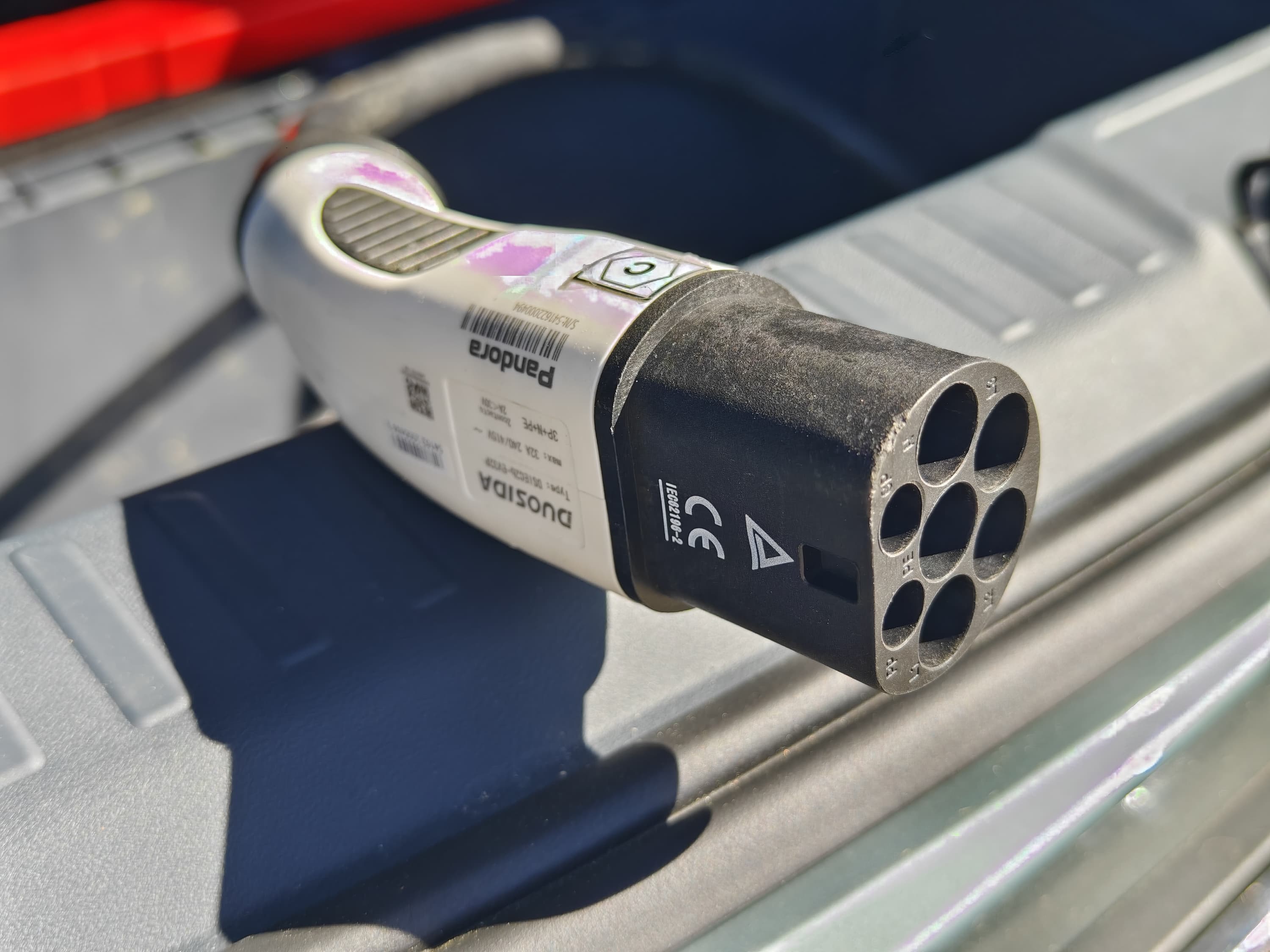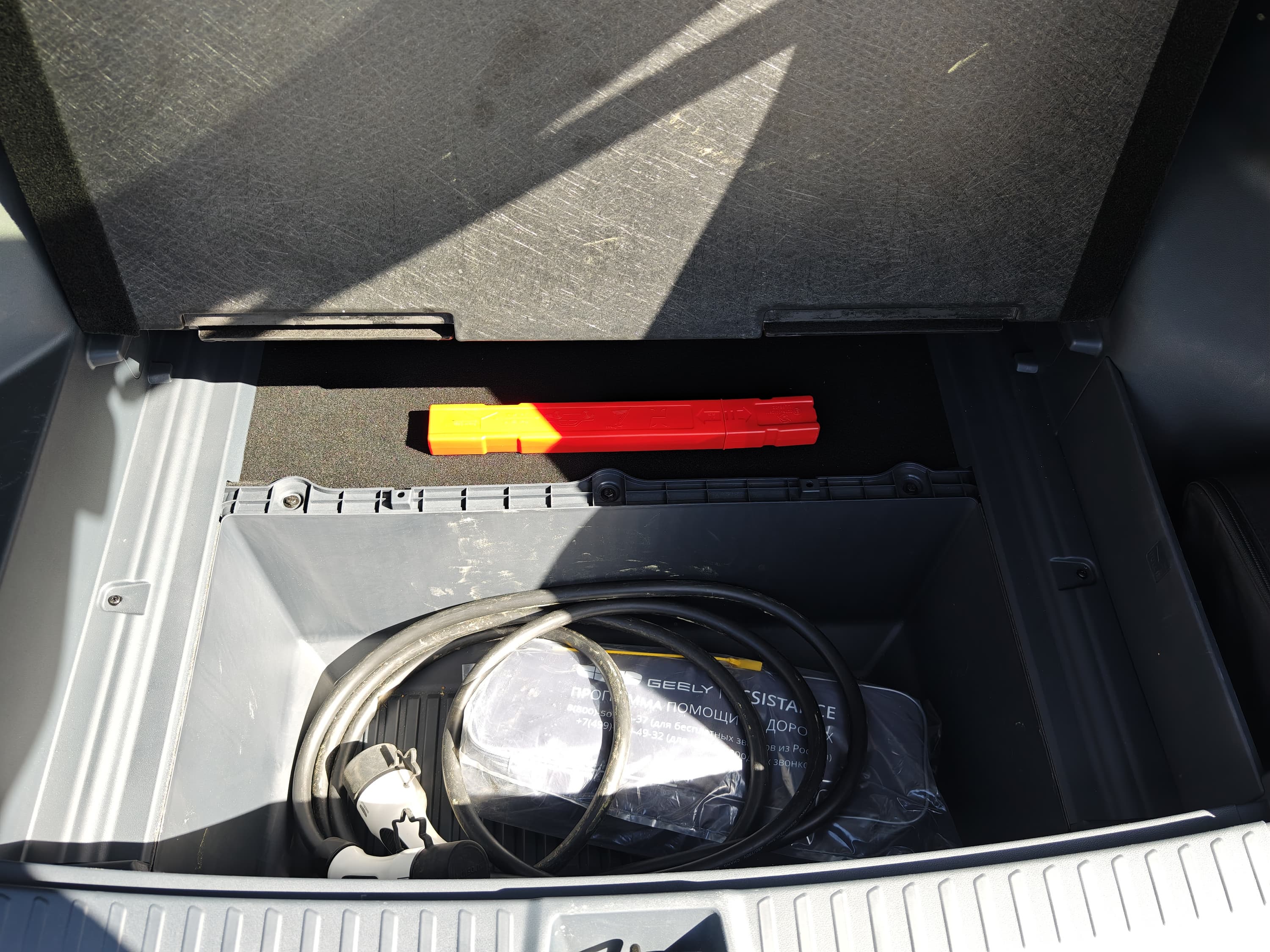 В поставке с Geely EX5 в подполе багажника находится зарядный кабель производства Pandora, Type 2 мама/папа, который предназначен для использования с бытовыми розетками или зарядными станциями. Этот кабель предназначен для медленной зарядки (AC) с максимальной мощностью до 7,4 кВт (32 А при однофазной сети), что соответствует стандартной домашней зарядке.