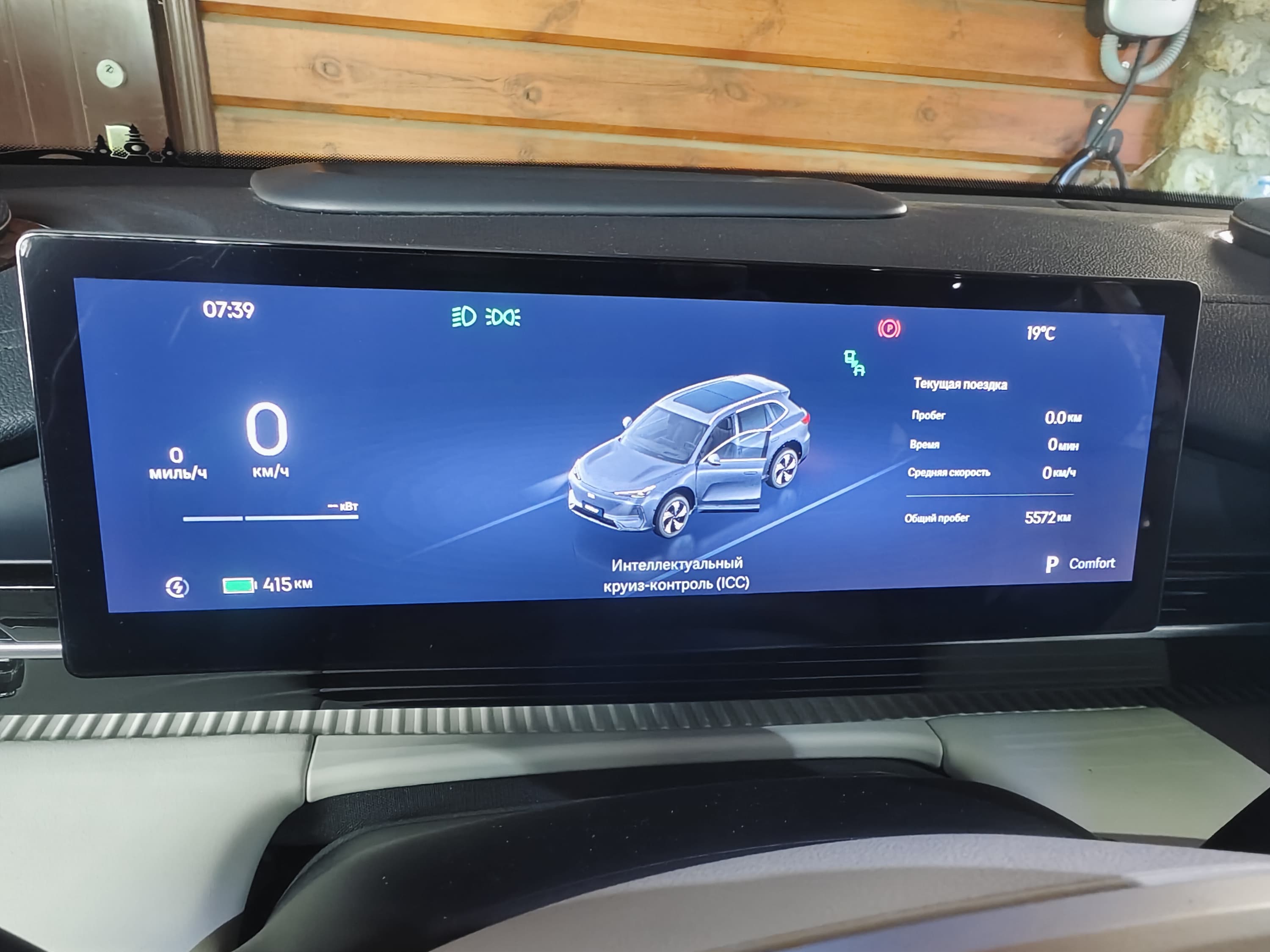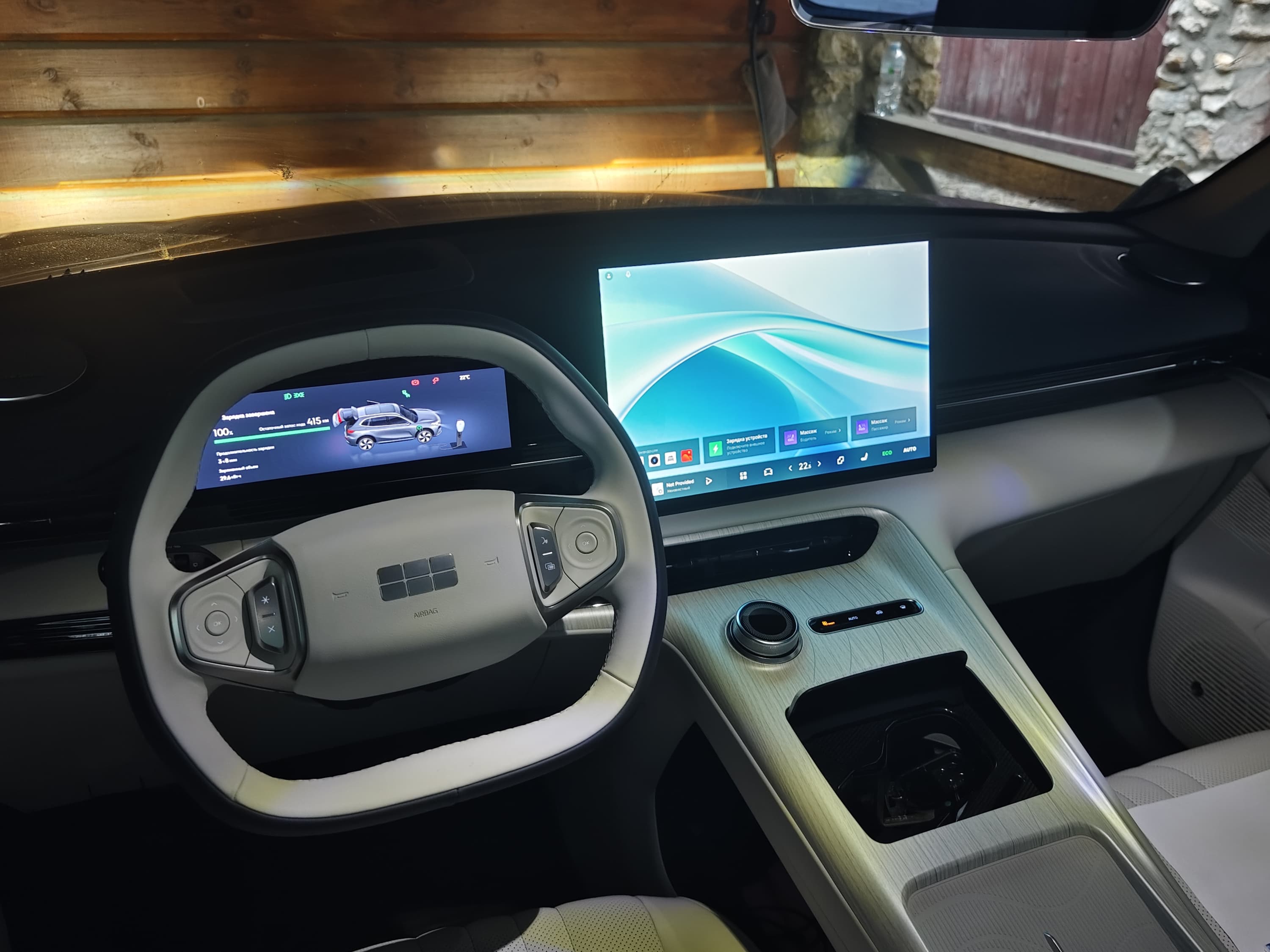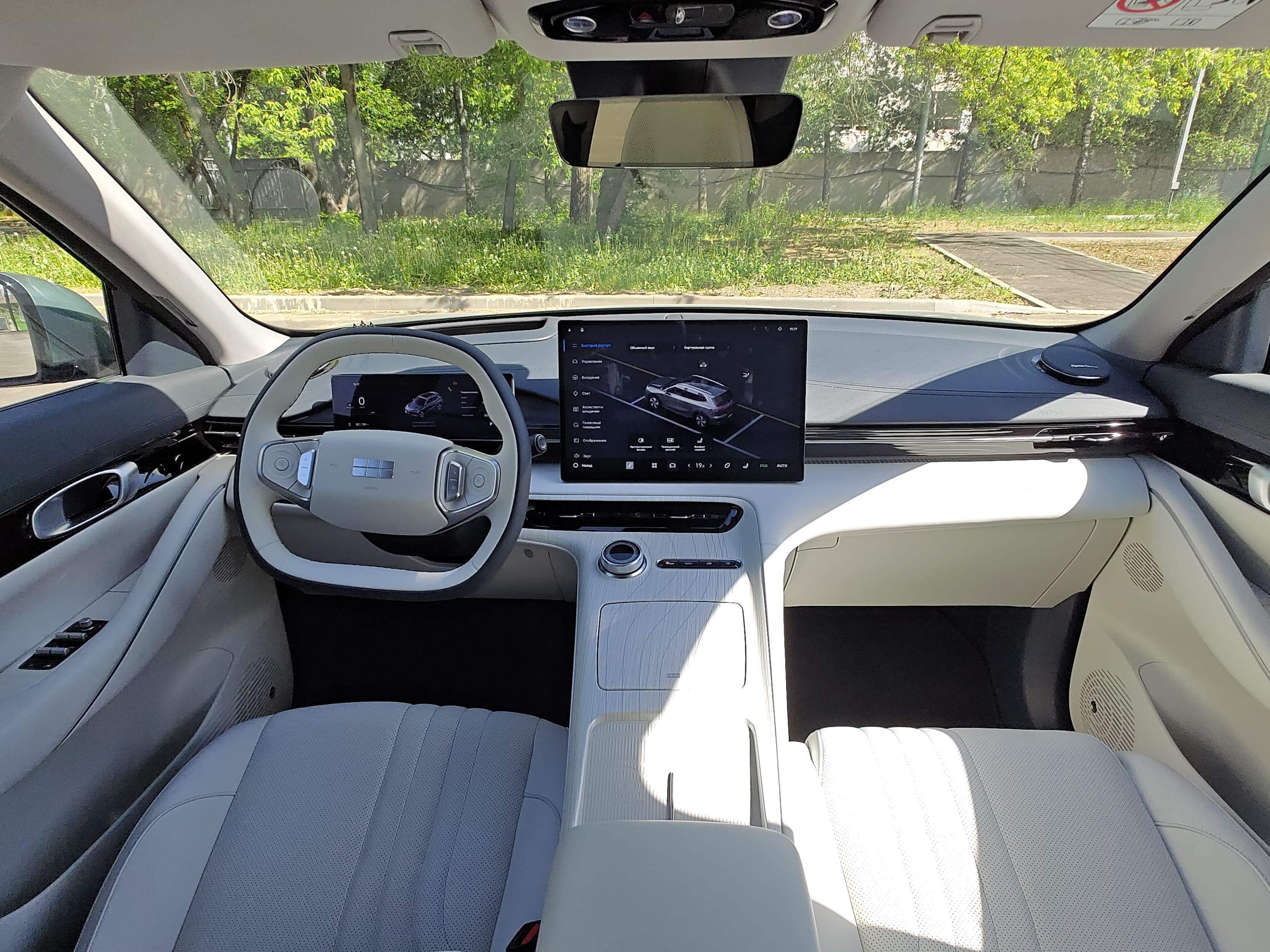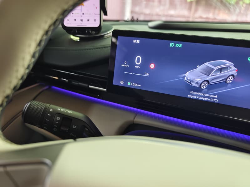Позади руля — цифровая приборная панель (примерно 10,2 дюйма), которая отображает скорость, заряд батареи, запас хода и данные ассистентов водителя. Панель настраиваемая, но не перегружена анимациями.