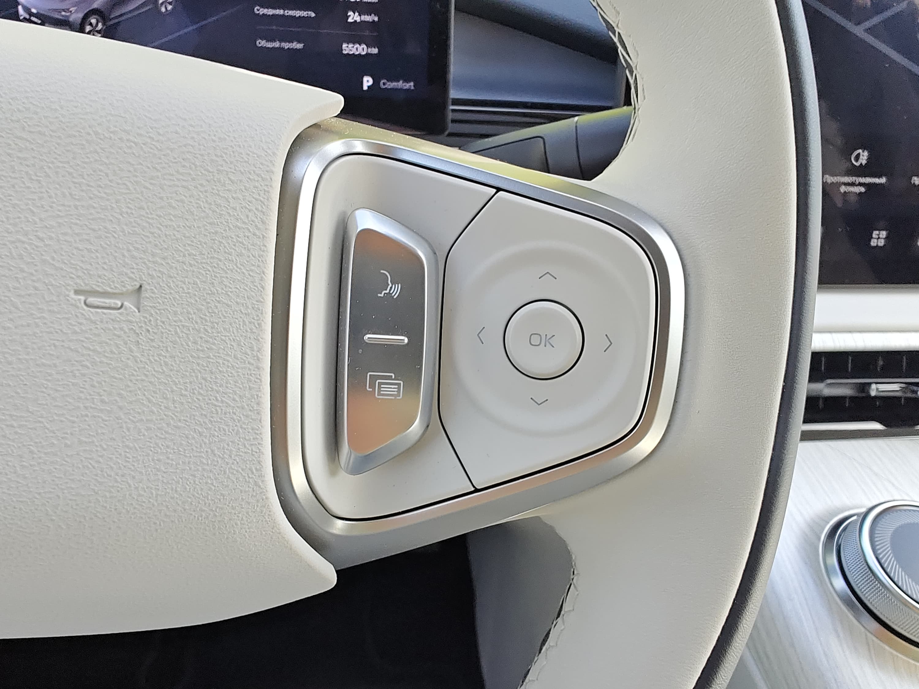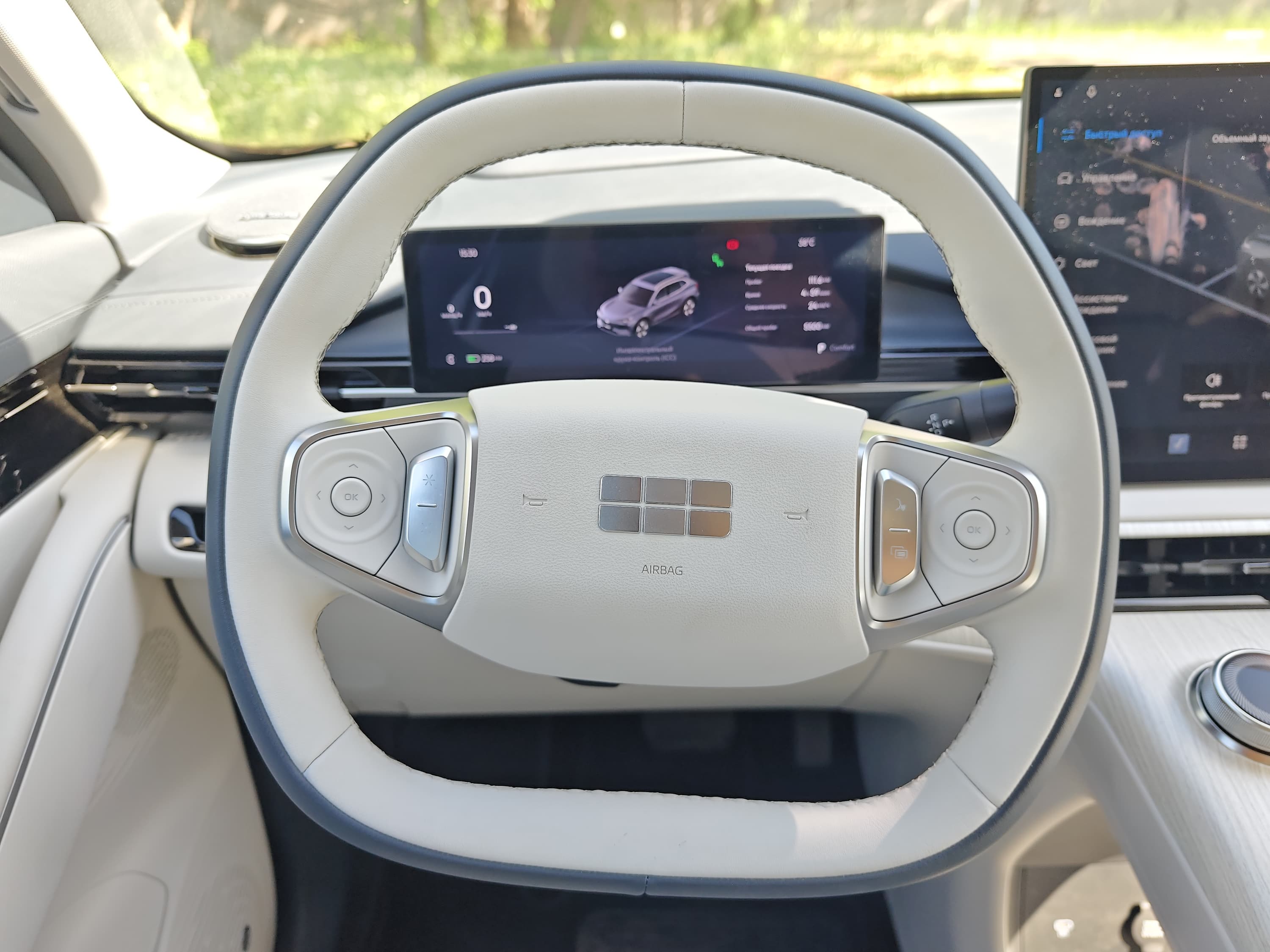 Он отделан экокожей с приятной текстурой, а кнопки на нём (для управления мультимедиа, круиз-контролем и голосовым ассистентом) расположены логично.