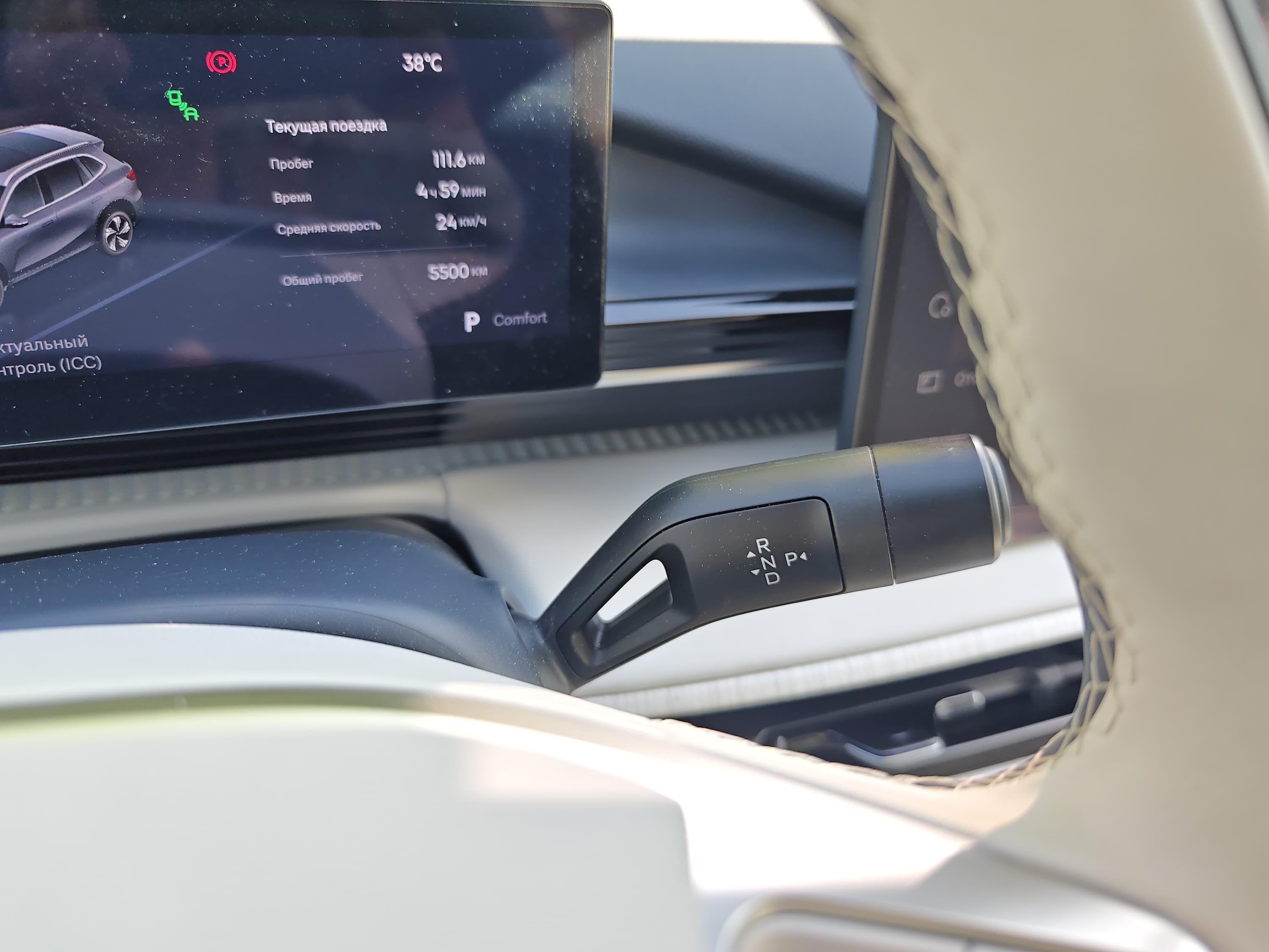 Селектор передач в Geely EX5 выполнен в виде рычага, расположенного на рулевой колонке. Это нетипичное, но продуманное решение для электромобиля. Такой дизайн — в тренде (например, такими подобные встречаются в Tesla Model 3 или некоторых моделях Volvo), он освобождает место для более удобного подлокотника и беспроводной зарядки. Селектор представляет собой обычный рычаг с несколькими позициями, а переключение между ними осуществляется лёгким движением пальцев — интуитивно и не требует внимания.