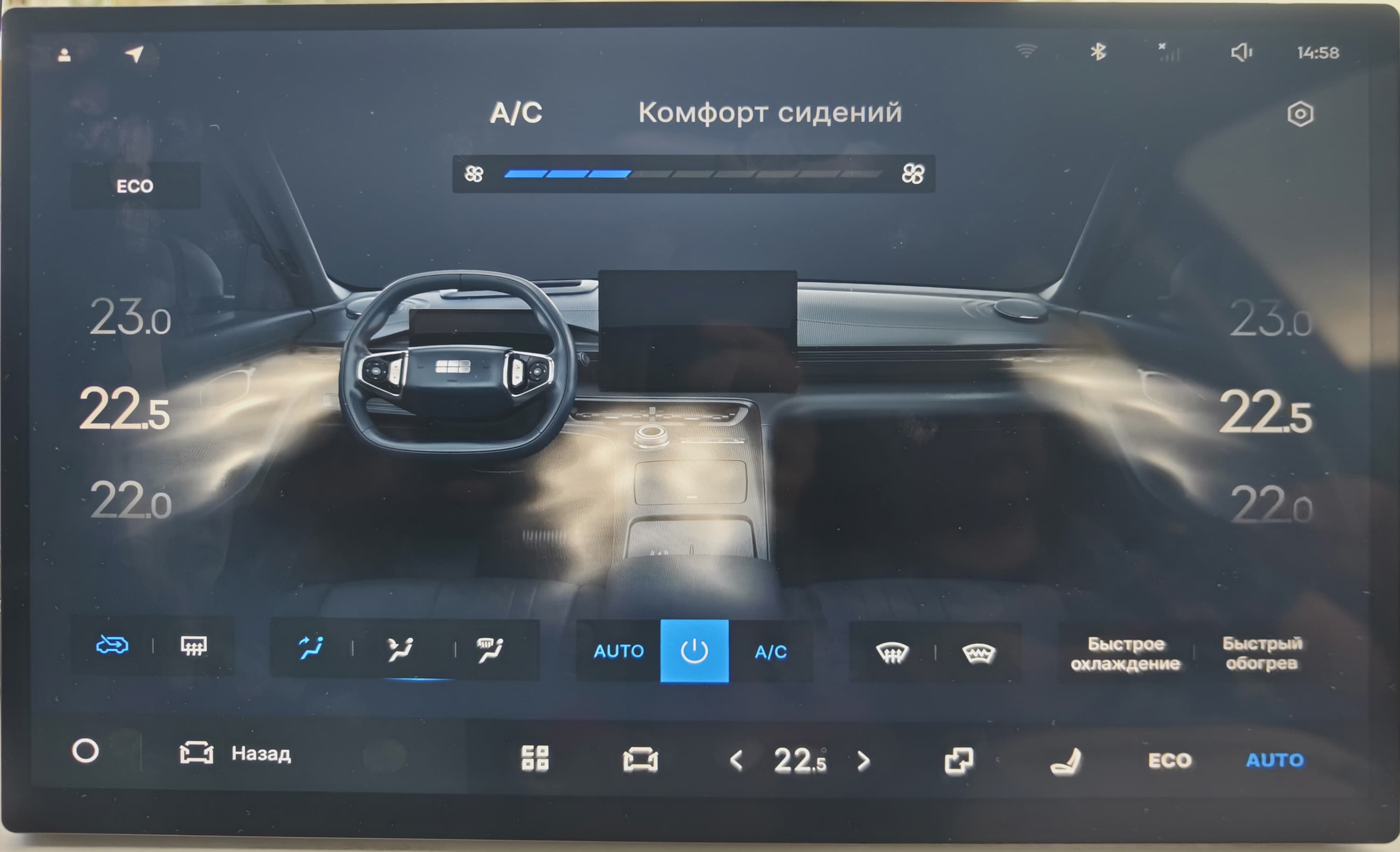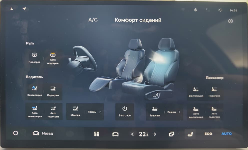 Климат-контроль в Geely EX5 однозонный, с управлением через центральный дисплей. Есть дефлекторы для задних пассажиров, но их эффективность средняя.