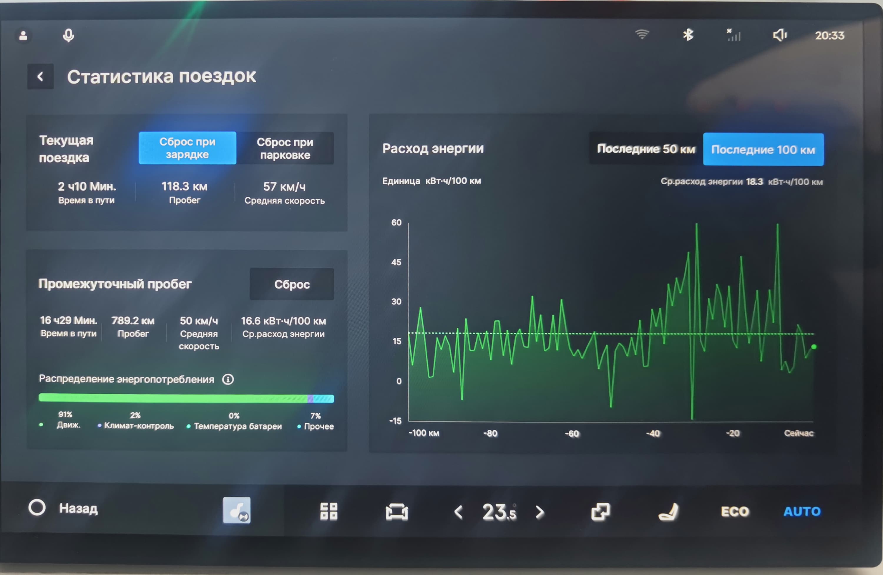 Не пасует электромобиль и на трассе. Была ситуация, когда «в хвост» пристроилась Toyota Camry, периодически помигивающая фарами с требованием уступить левую полосу. Не для соревнований ради, а для эксперимента педаль газа была нажата в пол и в зеркало заднего вида можно было наблюдать, как Camry, хоть и не стремительно, но отставала от электромобиля. На скоростях уже очень близким к основательно штрафуемым, Toyota оставила попытки обогнать Geely и взяла вправо.