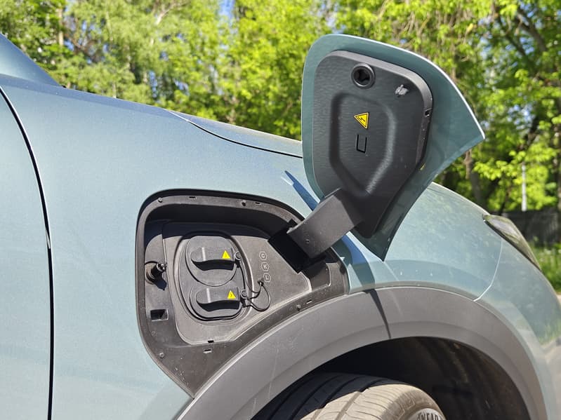 Лючок для зарядки у Geely EX5 находится на правом переднем крыле автомобиля. Он открывается снаружи простым нажатием на крышку. Под ней — разъёмы CCS Combo 2 и Type 2.