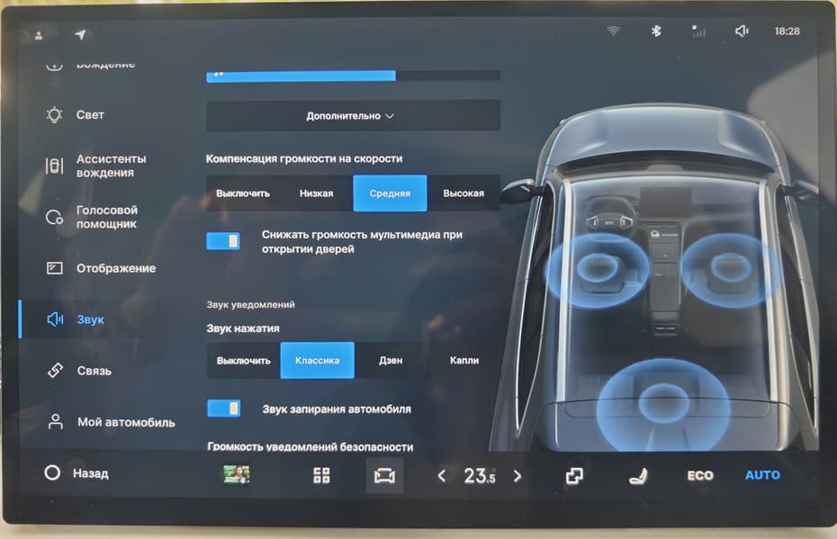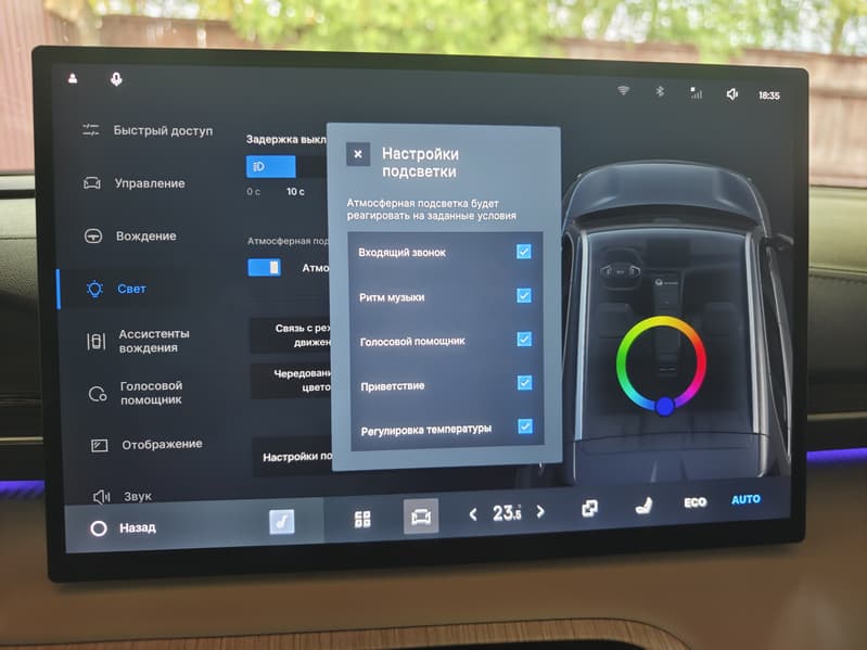 Атмосферная подсветка многоцветная, с настройкой через экран, охватывает центральную консоль, двери и пространство для ног.