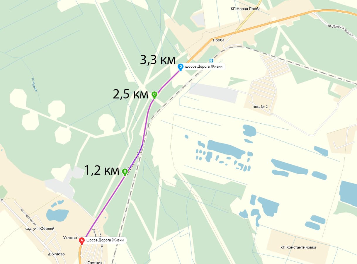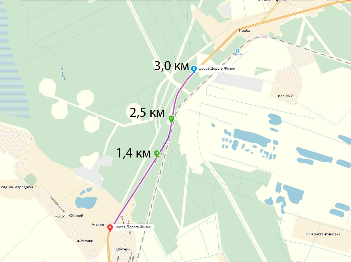 Напомним, что мы специально использовали те же маршруты, что и в прошлом тесте, чтобы сравнить рации между собой: был выбран относительно ровный участок «Дороги жизни» (шоссе, идущее от Санкт-Петербурга к берегу Ладожского озера). Одна из машин останавливалась и выезжала на обочину, вторая обнуляла одометр и продолжала движение. Рядом с точками на карте указаны показания одометра (что при относительно ровной, как видно на карте, дороге, приблизительно соответствует и расстоянию по прямой).