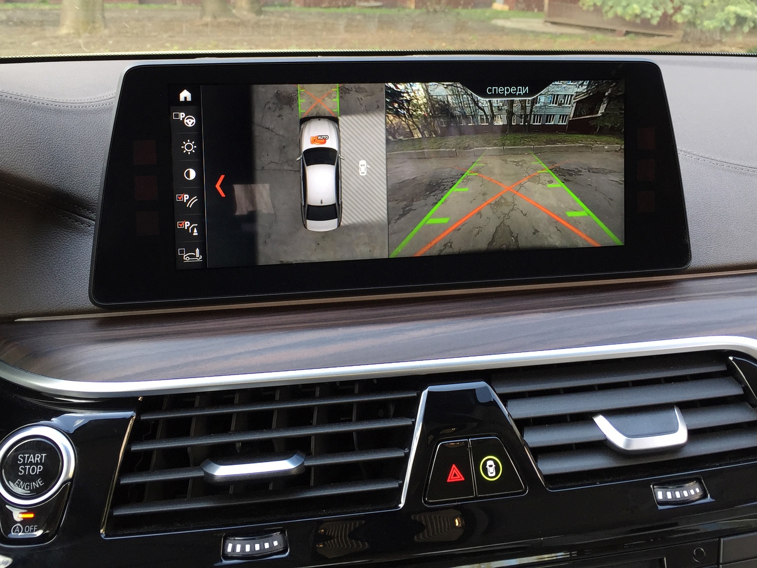 Большой экран позволяет почувствовать явную пользу от его наличия при парковке. Если в том же BMW X4 относительно небольшой экран работает в паре с немного «лагающей» камерой, отчего помогает эта связка не слишком сильно, то в новой пятерке парковаться с использованием помощников очень удобно, процесс максимально информативен.