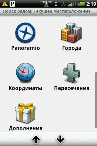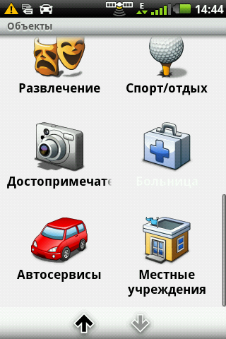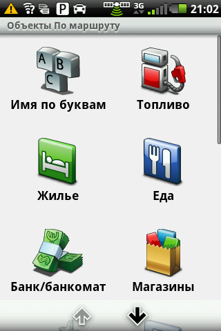 Объекты (POI) можно искать рядом или ближайшие по маршруту движения. 14 основных категорий POI разбиты по подкатегориям, что значительно облегчает выбор. Выбранную точку можно назначить как финиш маршрута или промежуточную точку, на некоторые точки можно сразу осуществить телефонный звонок.