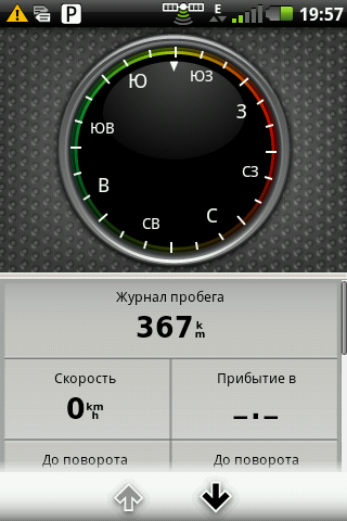 Правая кнопка всегда отображает скорость, при клике на нее открывается страница маршрутного компьютера. Над правой кнопкой, в случае если имеются данные о разрешенной на данном участке скорости, показывается знак ограничения скорости, а в случае ее превышения, цифры скорости становятся красными. Маршрутный компьютер показывает следующие данные:
