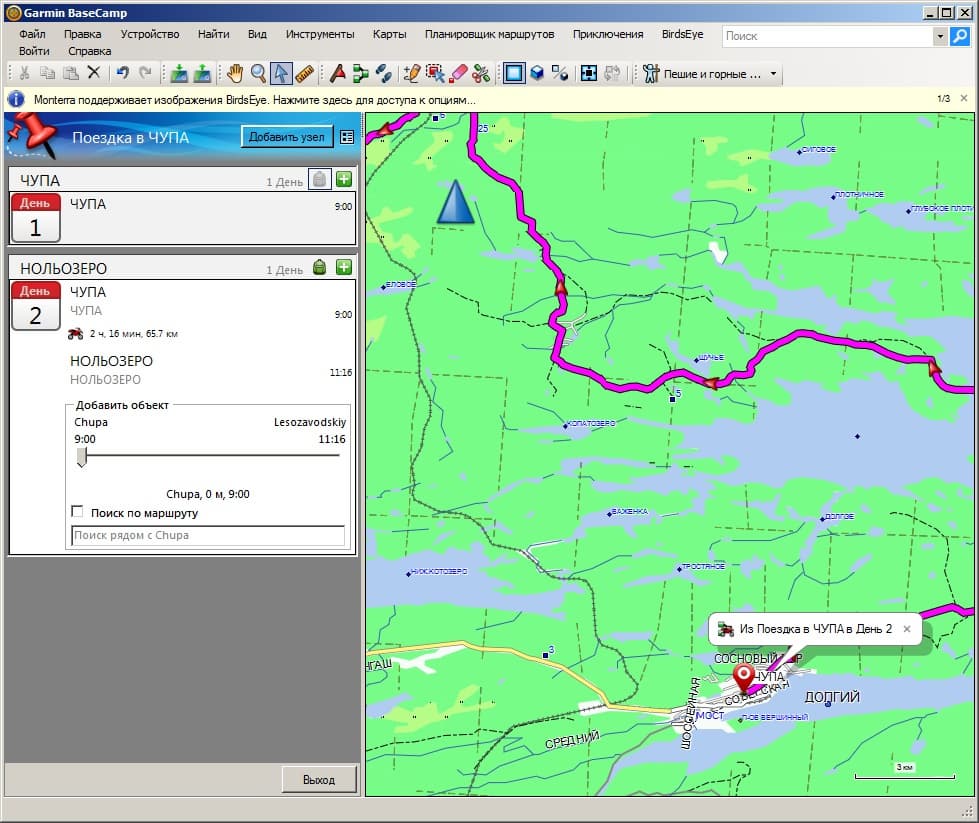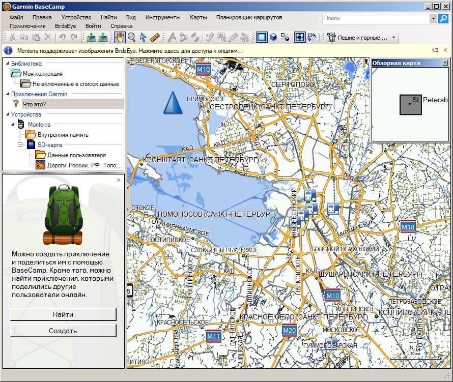 BaseCamp — это бесплатное фирменное приложение для ПК, которое позволяет просматривать карту, строить маршруты и загружать их в навигатор, создавать иллюстрированные «приключения» (микс из ваших треков и фотографий), а также выполнять ряд других второстепенных функций, таких как загрузка и покупка карт, а также редактирование точек, треков и маршрутов.