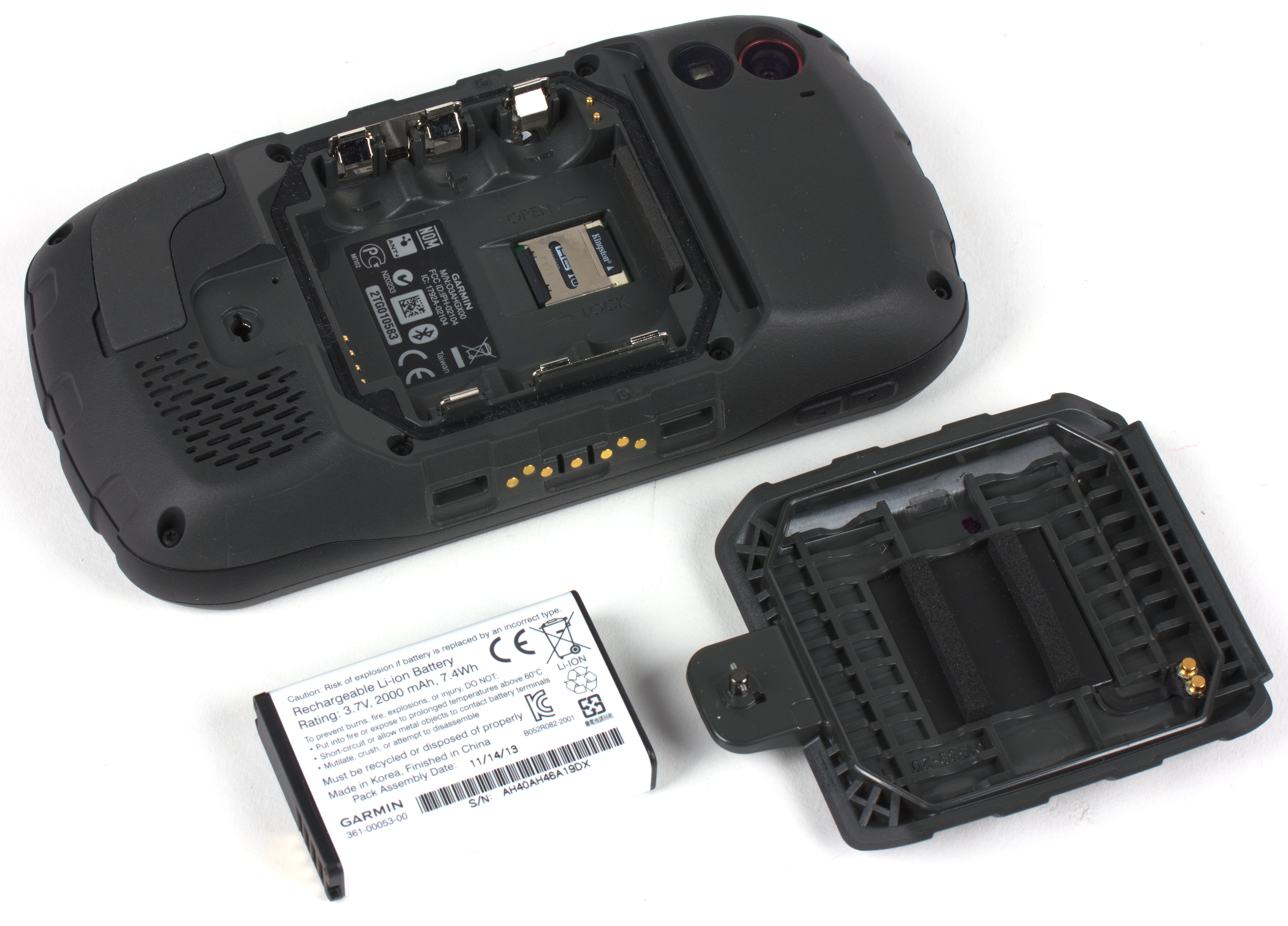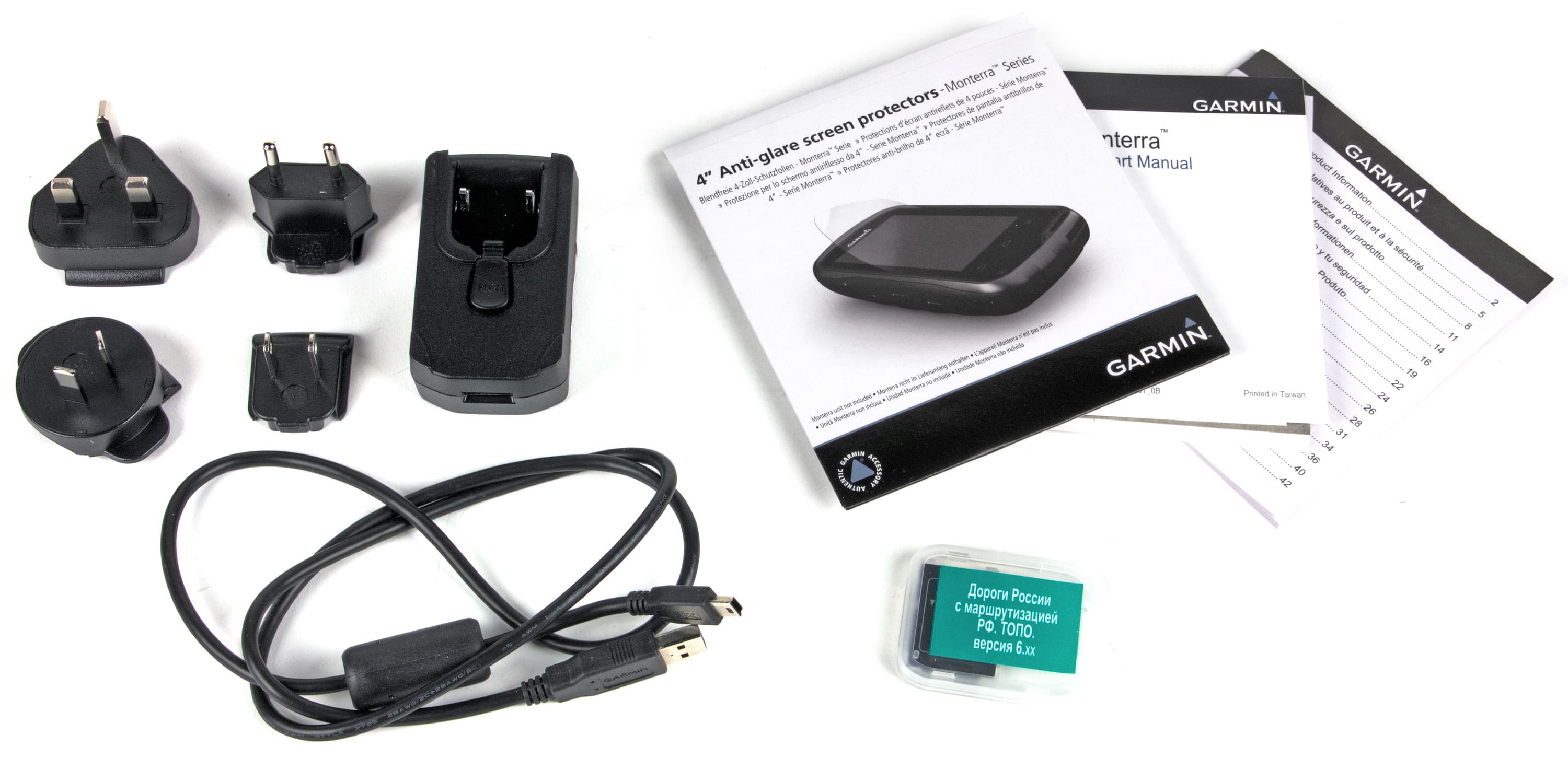 Комплектация спартанская. В коробке кроме самого устройства присутствует литий-ионный аккумулятор, зарядное устройство с несколькими насадками под разные типы розеток, а также краткая инструкция на нескольких языках, в число которых русский почему-то не вошел. Также в комплекте не оказалось обещанной SD-карты «Дороги России. Топо». Отсутствовали эти карты и в памяти самого аппарата, потому их пришлось отдельно запросить у компании Навиком, являющейся эксклюзивным дистрибьютором Garmin в России. Собственно, сам аппарат мы также получили из их рук в запечатанной заводской упаковке, и, как выяснилось позднее, наш экземпляр просто не прошел предпродажную подготовку, т. к. был взят из тестовой партии.
