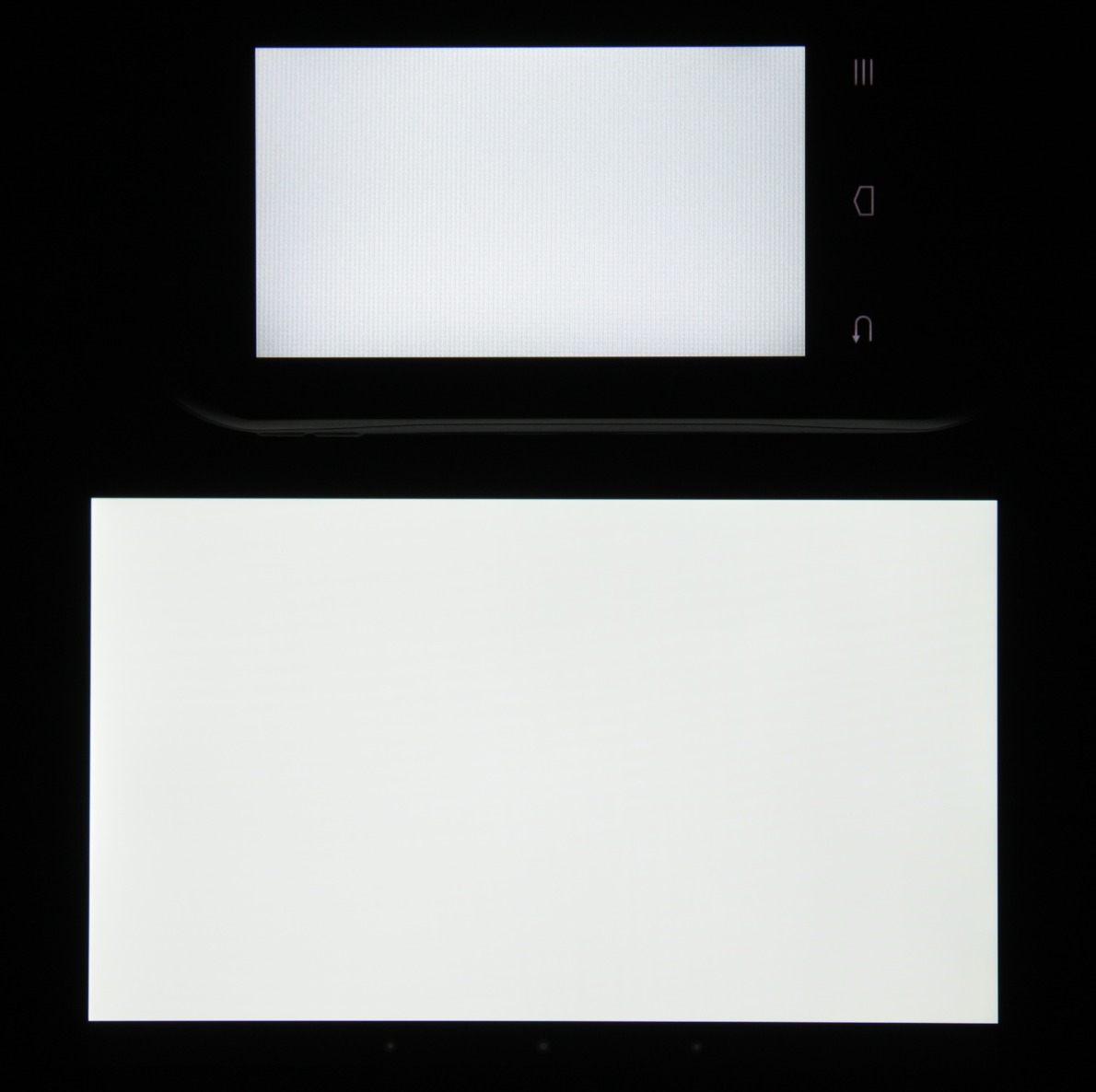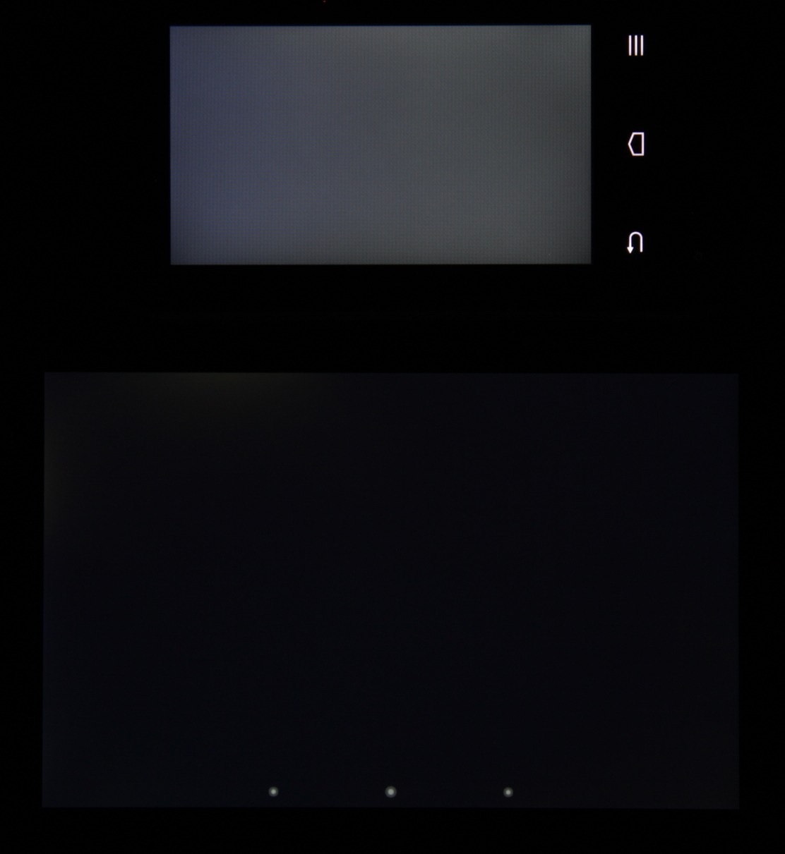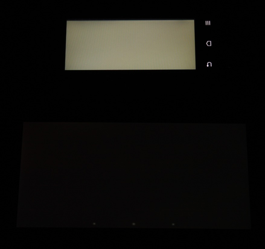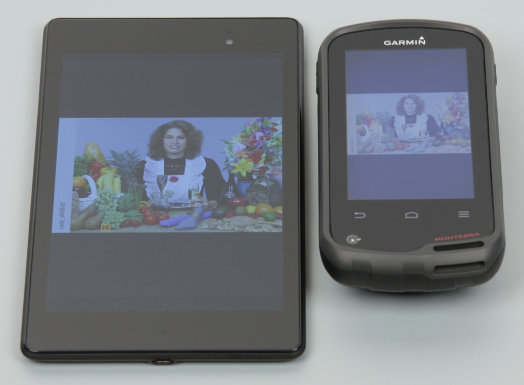 Тип установленной матрицы — TN. Экран имеет посредственные углы обзора при отклонении в любом направлении. При этом при отклонении вверх при некоторых углах инвертируются темные оттенки, а при отклонении вниз — светлые. Для сравнения приведем фотографии, на которых на экраны Nexus 7 и тестируемого устройства выведены одинаковые изображения, при этом яркость обоих экранов установлена примерно на 200 кд/м². Перпендикулярно к экранам тестовая картинка (из-за низкого разрешения экрана на части фотографий присутствует муар):