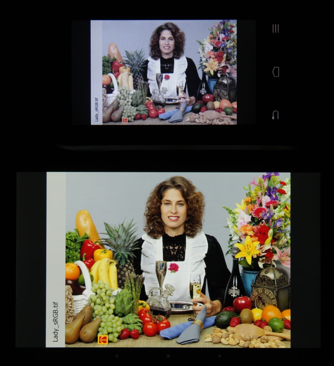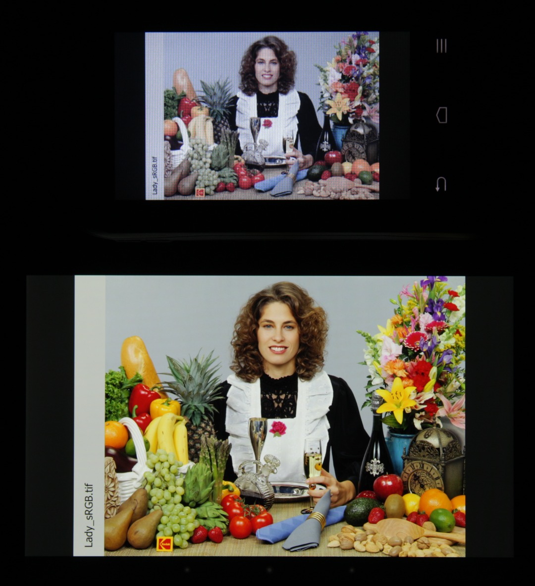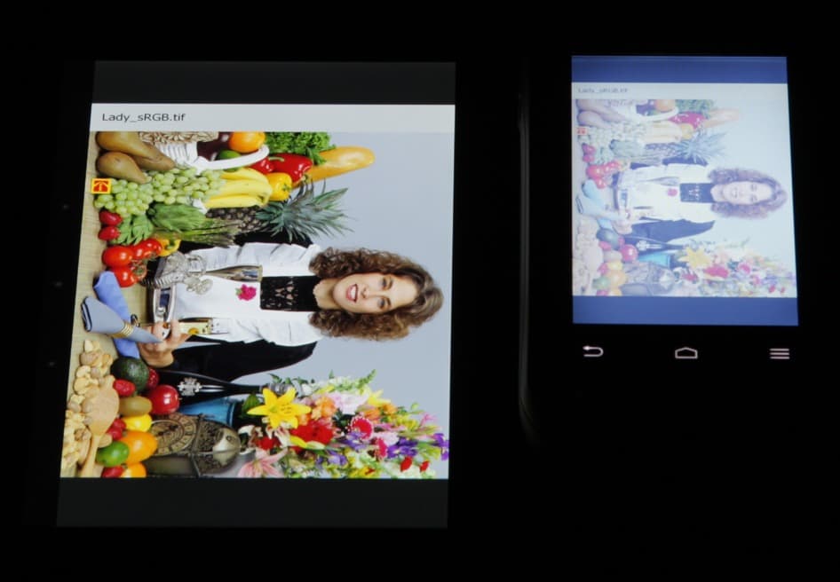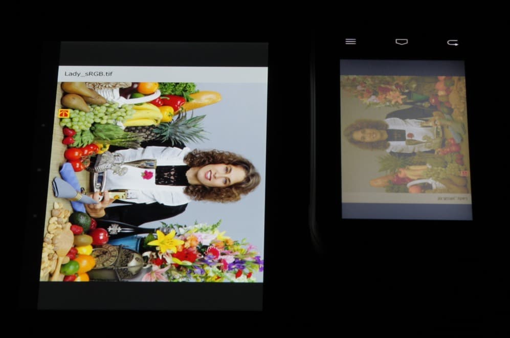 Тип установленной матрицы — TN. Экран имеет посредственные углы обзора при отклонении в любом направлении. При этом при отклонении вверх при некоторых углах инвертируются темные оттенки, а при отклонении вниз — светлые. Для сравнения приведем фотографии, на которых на экраны Nexus 7 и тестируемого устройства выведены одинаковые изображения, при этом яркость обоих экранов установлена примерно на 200 кд/м². Перпендикулярно к экранам тестовая картинка (из-за низкого разрешения экрана на части фотографий присутствует муар):