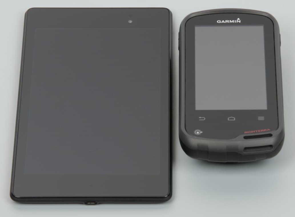 Лицевая поверхность экрана выполнена в виде стеклянной пластины с зеркально-гладкой поверхностью, устойчивой к появлению царапин. Судя по отражению объектов антибликовые свойства экрана хуже, чем у экрана Google Nexus 7 (2013) (далее мы сравниваем именно с ним). Для наглядности приведем фотографии, на которых в выключенных экранах отражается белая поверхность (Garmin Monterra — справа, далее их можно различать по размеру):