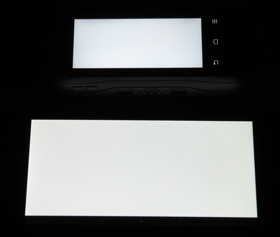 Отметим хорошую равномерность яркости и цветового тона у обоих экранов. Яркость белого поля при отклонении в любом направлении уменьшается примерно в такой же степени, что и в случае Nexus 7. Для примера при отклонении влево: