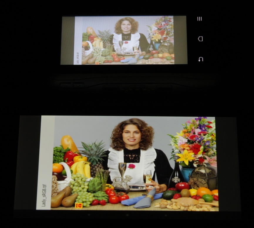 Интервалы между кадрами (или группами кадров) чередуются немного неравномерно, файлы 720p с 60 кадр/с воспроизводятся с пропусками единичных кадров, а файлы 1080p с 50 и 60 кадр/с не воспроизводятся вовсе. При воспроизведении видеофайлов с разрешением 720p или 1080p и соотношением сторон 16:9 изображение собственно видеофайла выводится точно по границе экрана. Отображаемый на экране диапазон яркости соответствует стандартному диапазону 16—235 — в тенях отображаются все градации оттенков, но в светах несколько ближайших к белому оттенков неотличимы от белого по яркости, что, впрочем, было определено при аппаратном тестировании экрана. Динамичное изображение выявило некоторые особенности экрана: вывод имеет какой-то построчный характер, из-за чего объекты в движении (или неподвижные, но при движении взгляда вдоль длиной стороны экрана) разбиваются на строки, идущие перпендикулярно длинной стороне экрана. Также от ярких объектов есть тени, заметные на темном фоне и идущие перпендикулярно длинной стороне экрана.