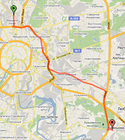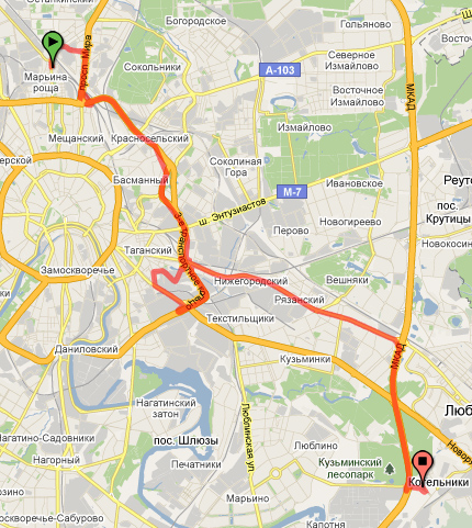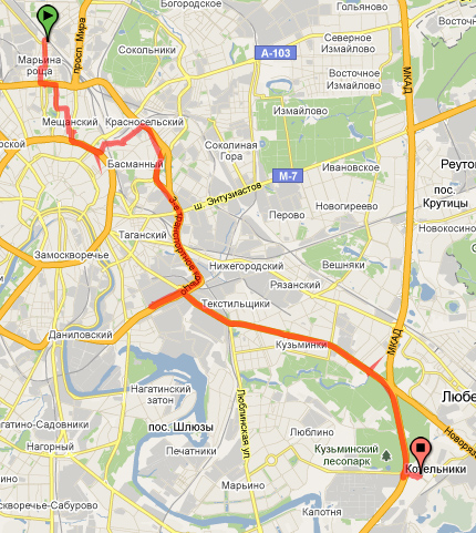 С ТТК маршрут был проложен на улицу Красноказарменную, далее через шоссе Энтузиастов на Площадь Ильича и Рогожский вал. Далее экипаж свернул на 1-ую Дубровскую и по Шарикоподшипниковской пересек ТТК, объезжая Волгоградский проспект по Южнопортовой. Проехав через весьма пробкоопасный тоннельчик на Люблинскую, вышли на Белореченскую и соответственно на финишную прямую — улицу Верхние поля. Маршрут был вполне антипробковый, но реального времени не сэкономил.