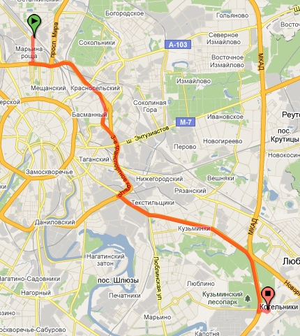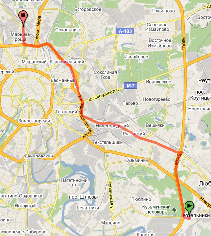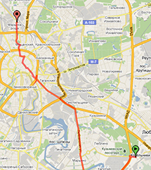 Обратный маршрут был проложен через Проспект Мира и Рижскую развязку, на Третье Транспортное Кольцо. Решение спорное, но оригинальное. А вот съезд с ТТК после Шоссе Энтузиастов, заезд на него в районе Нижегородской улицы и через сто метров съезд на улицу Скотопрогонную, выезд на Волгоградский проспект с возвратом на ТТК и Нижегородскую улицу — маневр "за гранью добра и зла". И вновь, как нам кажется, виноваты неполные данные о заторах. Дальнейший маршрут строился без неожиданностей, по Рязанскому проспекту и МКАД.