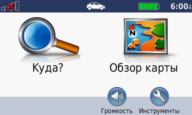 Автомобильный режим — простой и привычный для автонавигаторов Garmin последних лет. Большие пиктограммы «Куда?» и «Обзор карты», простой ввод адреса или выбор места назначения из базы POI, отображение карты в перспективе и голосовые подсказки. В автомобильном режиме предусмотрена возможность сохранения тысячи пользовательских точек и десяти треков. Чтобы переключиться в водный режим, нужно нажать пиктограмму автомобиля в верхней части дисплея и подтвердить свой выбор.