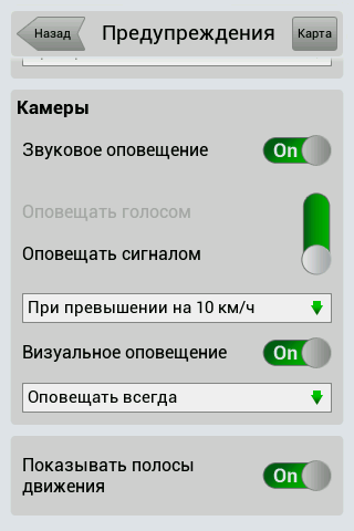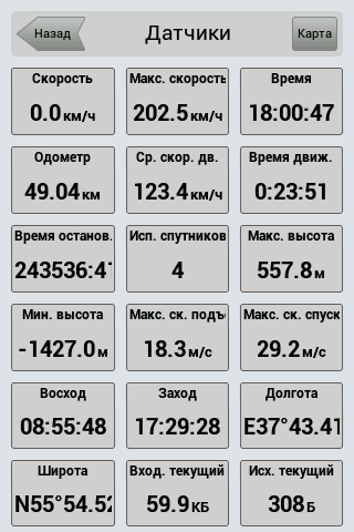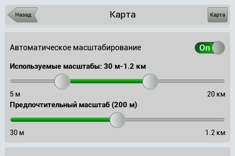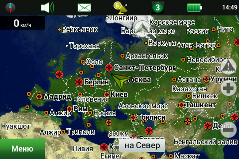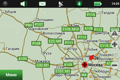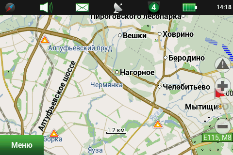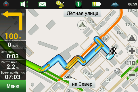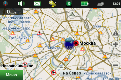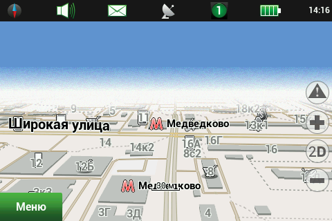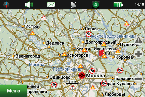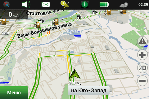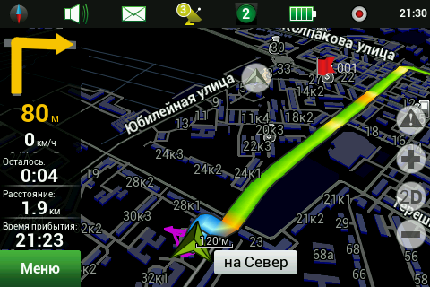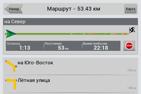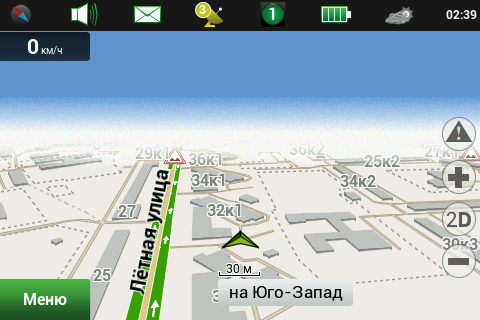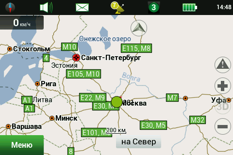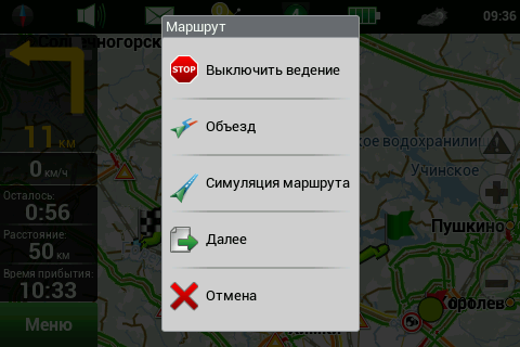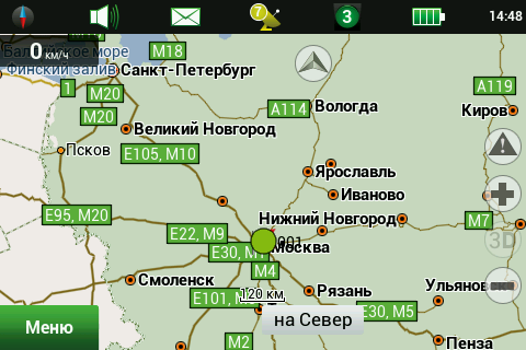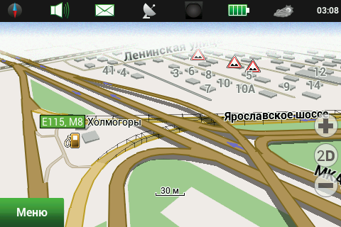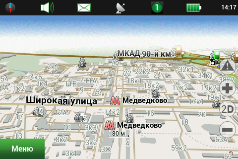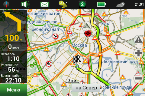 Рейсовые автобусы, а также спецслужбы, мы надеемся, по навигационным системам не ездят, а излишние опции только запутывают пользователя и увеличивают вероятность ошибки. Доступны следующие опции маршрута — избегать разворотов, избегать платных дорог, избегать грунтовых дорог, избегать паромных переправ. Маршрутизация может быть как по дорогам, так и напрямую (парапланеристы и грибники будут довольны). Можно выбрать стратегию построения маршрута, прокладывать короткий или быстрый маршрут. По результатам полевого тестирования, хочется иметь больше вариантов построения маршрута, к примеру: кратчайший, короткий (по дорогам, но без дворов), оптимальный (компромисс между числом маневров и расстоянием), удобный (с минимумом маневров) и быстрый. В имеющийся версии короткий маршрут строится через дворовые проезды, что противоречит ПДД и совершенно бесполезно, ввиду большого числа ошибок карты во дворах. Опция избегать платных дорог работает, но нам кажется правильным добавить еще один пункт — «спрашивать». Для паромных переправ следует учитывать время их работы и предупреждать об этом пользователя. Конкурентные продукты давно и успешно используют перекрытия по расписанию. ![]() Во время ведения по маршруту в левой части экрана показывается (сверху вниз): указатель следующего маневра, с указанием расстояния; время до финиша, расстояние до финиша и расчетное время прибытия. Полевое тестирование показало очень точный расчет времени, так, в поездке на расстояние 340 километров время прибытия было предсказано с точностью около 5 минут. При включении сервиса Навител.Пробки время в пути было рассчитано с учетом наличия заторов. Более ранние версии «Навител Навигатор» считали время исходя из текущей скорости, что в пробках выдавало совершенно дикие дни и недели в пути. Пункт меню «маршрут» покажет нам план маршрута, причем при использовании сервиса Навител.Пробки линия маршрута, как и на карте, будет раскрашена в цвета полученных заторов. Доступен и список всех маневров по маршруту, но, к сожалению, клик на маневр не приводит к показу этого участка на карте. Указывается расстояние до маневра, но не время. Маршрут можно сохранить в формат Гармина и ОziExplorer, а также загрузить, причем выбор форматов данных для импорта очень большой. Через быстрое меню маршрута можно включить режим объезда, программа заново проложит маршрут, как если бы впереди по маршруту был затор. Кроме того, через быстрое меню маршрута можно включить симуляцию движения по маршруту. Во время симуляции можно увидеть расчетные скорости движения на текущем участке дороги, но информация о заторах полученная через сервис Навител.Пробки не учитывается при симуляции. Узнать, чему равен какой цвет затора, таким способом не получится. На многополосных развязках перед маневром показывается информация о рекомендуемой полосе движения. Во время движения масштаб карты может изменяться, показывая более детальную картинку на низкой скорости и уменьшая масштаб по мере роста скорости. Автоматическая регулировка масштаба сделана очень удобно, можно задать минимальный и максимальный масштабы, а также предпочтительный масштаб. Задается и задержка перехода к расчетному масштабу при изменении масштаба пользователем. ![]() Изменить ориентацию карты, переключить вид карты и сменить скин 