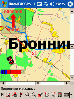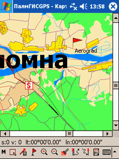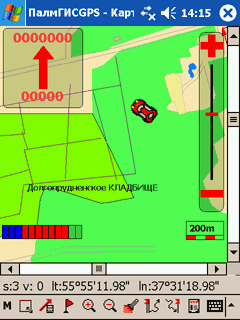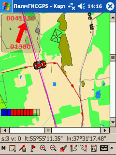 Первая неприятность поджидает нас еще до старта программы. Заключается она в том, что приемник GPS не желает находить достаточное количество спутников. О чем ПалмГИСGPS честно сообщает. Колдуем над положением приемника относительно тела, окрестных домов и прочих препятствий. Программа незамедлительно отображает забавный автомобильчик где-то внутри соседнего дома. Потом в течение нескольких минут указатель прикидывается флюгером, быстро меняя направление. Положение индикатора тоже не остается постоянным, колеблясь между внутренностями дома и двором. Такое поведение вполне нормально, мало того, именно оно и ожидалось. Приемник GPS выдает координаты с определенной точностью (некоторые модели могут даже выдавать оценку погрешности вычислений). Скорость и направление перемещения вычисляются исходя из разности предыдущего и нового значения координат. Поскольку приемник каждый раз возвращает данные с некоторой ошибкой, при скоростях движения существенно меньших, чем погрешность выдачи координат, эффекта «флюгера в соседнем доме» избежать не удастся.