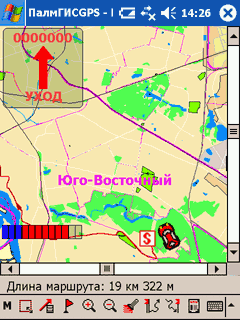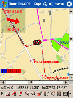 Но вернемся же к нашим баранам. Воспользоваться функциями прокладки маршрута очень просто. Выбираем «Старт» из подменю «Путь», в качестве начала указываем GPS. Точку «Финиш» назначим с помощью поиска по адресу. Маршрут успешно создан, красная линия со стрелками направлений указывает нам путь. По умолчанию ПалмГИСGPS настроена так, что карта автоматически прокручивается к точке текущего положения, указатель всегда будет находиться в центре экрана. Можно отключить принудительное скроллирование или «привязать» машинку к нижнему краю экрана (в этом режиме карта будет автоматически разворачиваться при изменении направления движения — очень удобно!). Экстремалы могут совсем отключить отображение карты, оставить только панель поворота, на которой огромная красная стрелка будет указывать направление движения и расстояние.