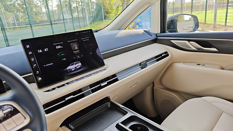 В максимальной комплектации для задних пассажиров предусмотрены отдельные экраны, встроенные в подголовники передних сидений. В нашем же случае даже карманы для смартфонов в капитанских креслах на втором ряду были лишены беспроводной зарядки для телефонов (да-да, для китайских автомобилей премиум-класса это уже можно считать заметным минусом).