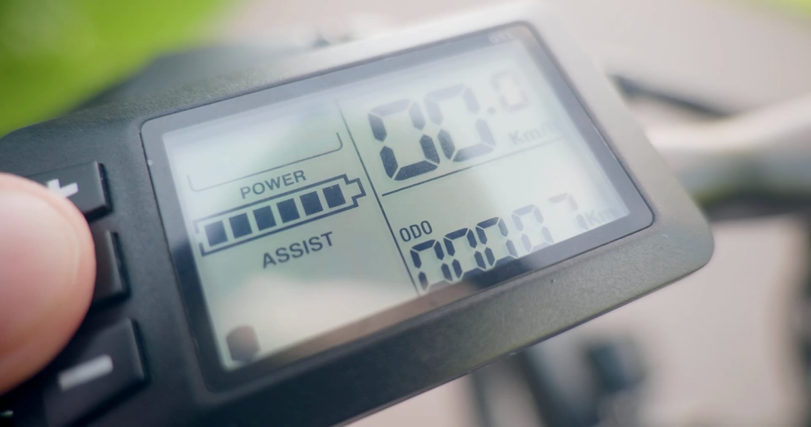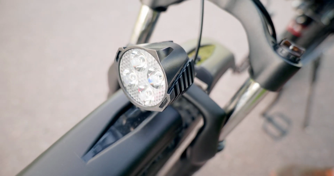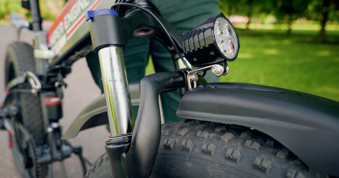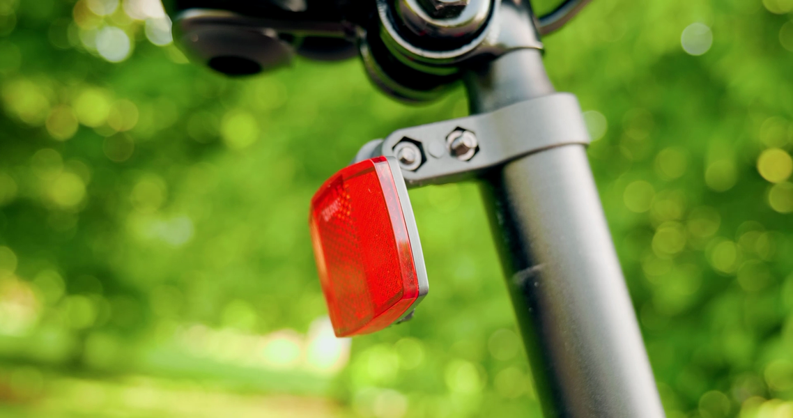 Режим выбирается через велокомпьютер. На нем же видно заряд батареи, скорость, пробег и ток. Под ним на левой рукоятке есть две кнопки, одна отвечает за очень громкий звуковой сигнал, другая — за фонарик. Катафот тоже есть, а это, кстати, обязательно по закону, и странно, что многие велосипеды продаются даже без такого базового обязательного обвеса.