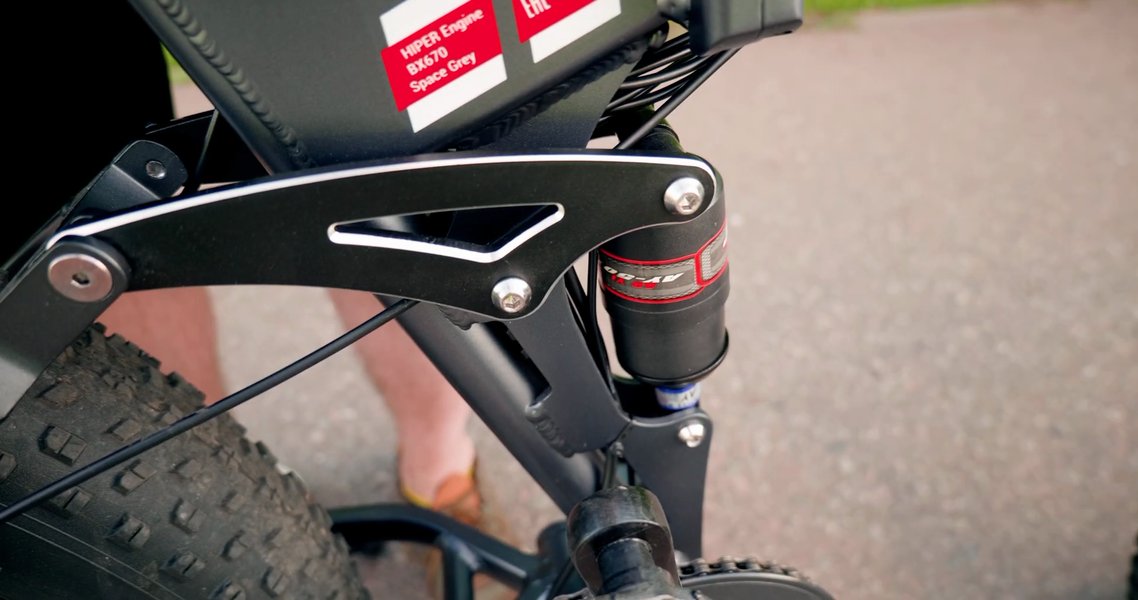 Плюс есть амортизация на обоих концах. Спереди — в вилке, и её можно просто заблокировать, а сзади стоит пружинный амортизатор, он затягивается и таким образом регулируется. Вес ездока, конечно, ограничен, но планка высокая — 130 килограмм.