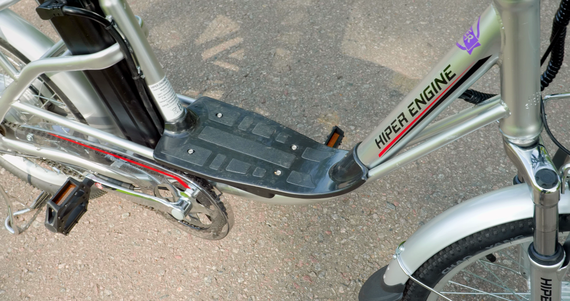 Потому что ехать можно и исключительно на электрической тяге, вообще не помогая ногами, для этого нужно повернуть ручку. Даже не нужно отталкиваться, велосипед сразу поедет, а ноги можно поставить на подставку. Я выше нормативного роста, но у меня колени в подбородок не упирались.