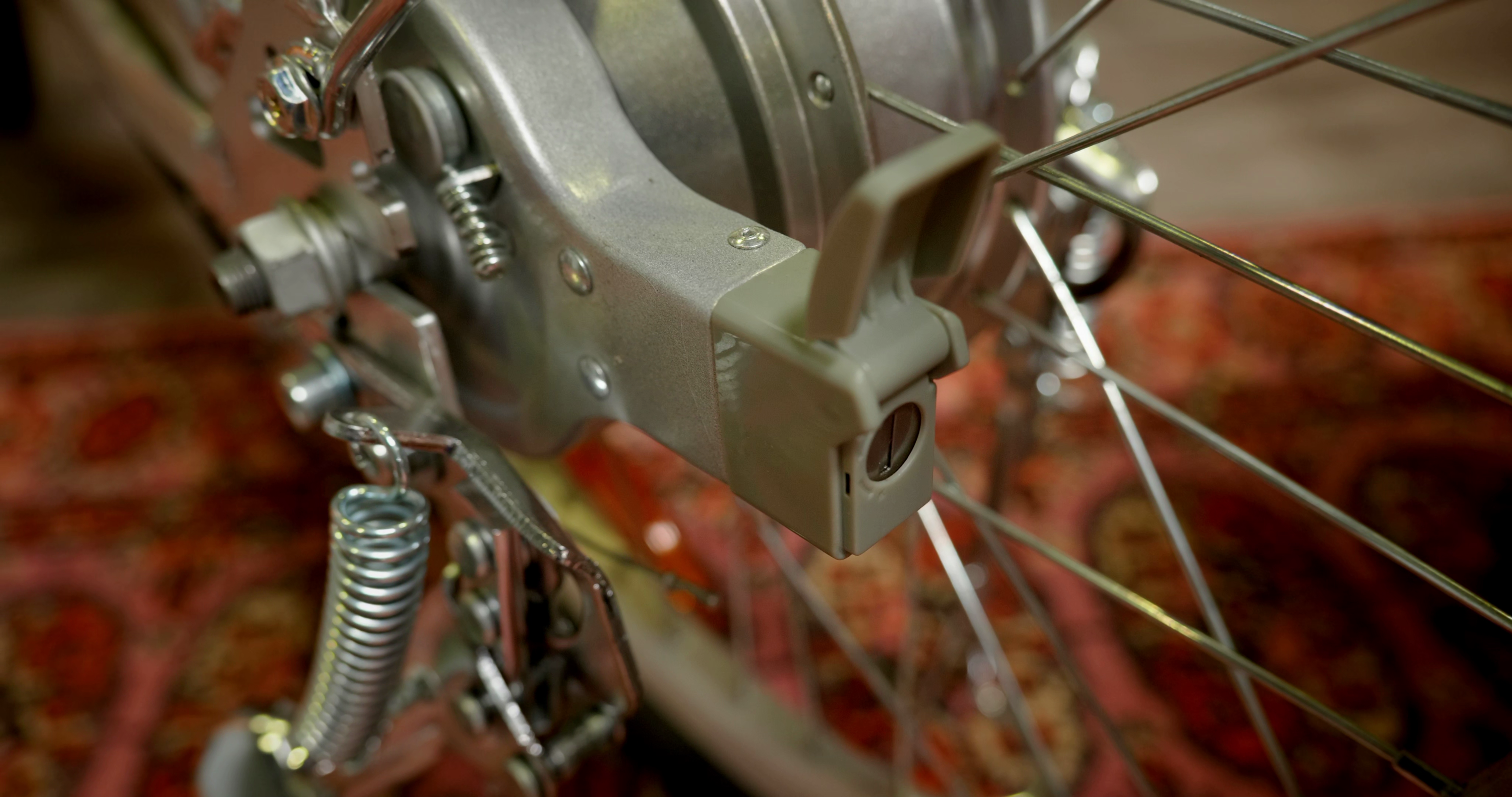 На обоих колёсах у велосипеда барабанные тормоза. Полную блокировку передний тормоз не обеспечивает, и это плюс — в том смысле, что на таком велосипеде не перевернешься. Если зажать оба рычага сразу, то останавливаешься довольно быстро, но заднее колесо блокируется и может немного занести.