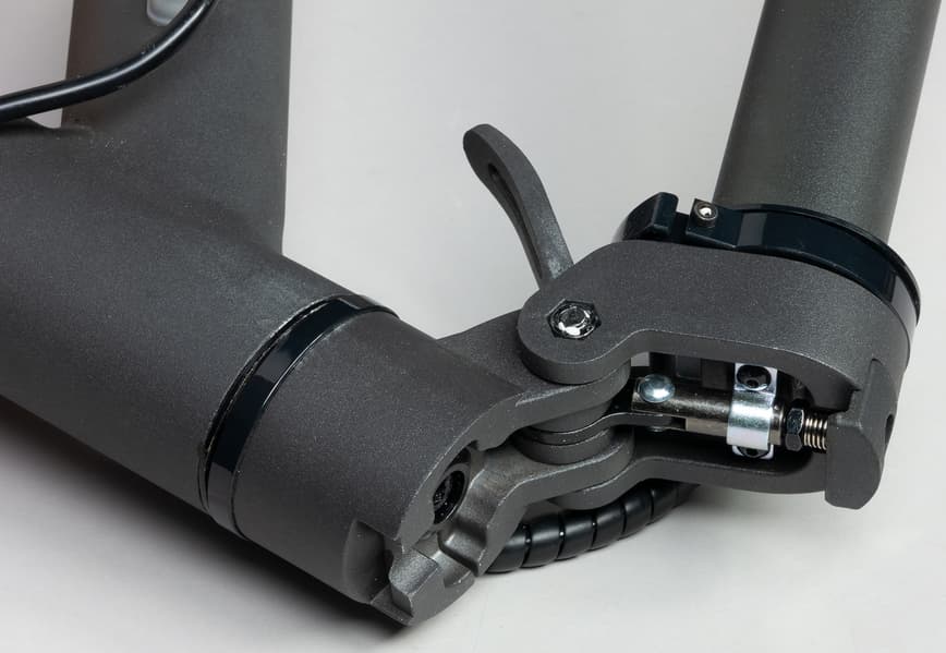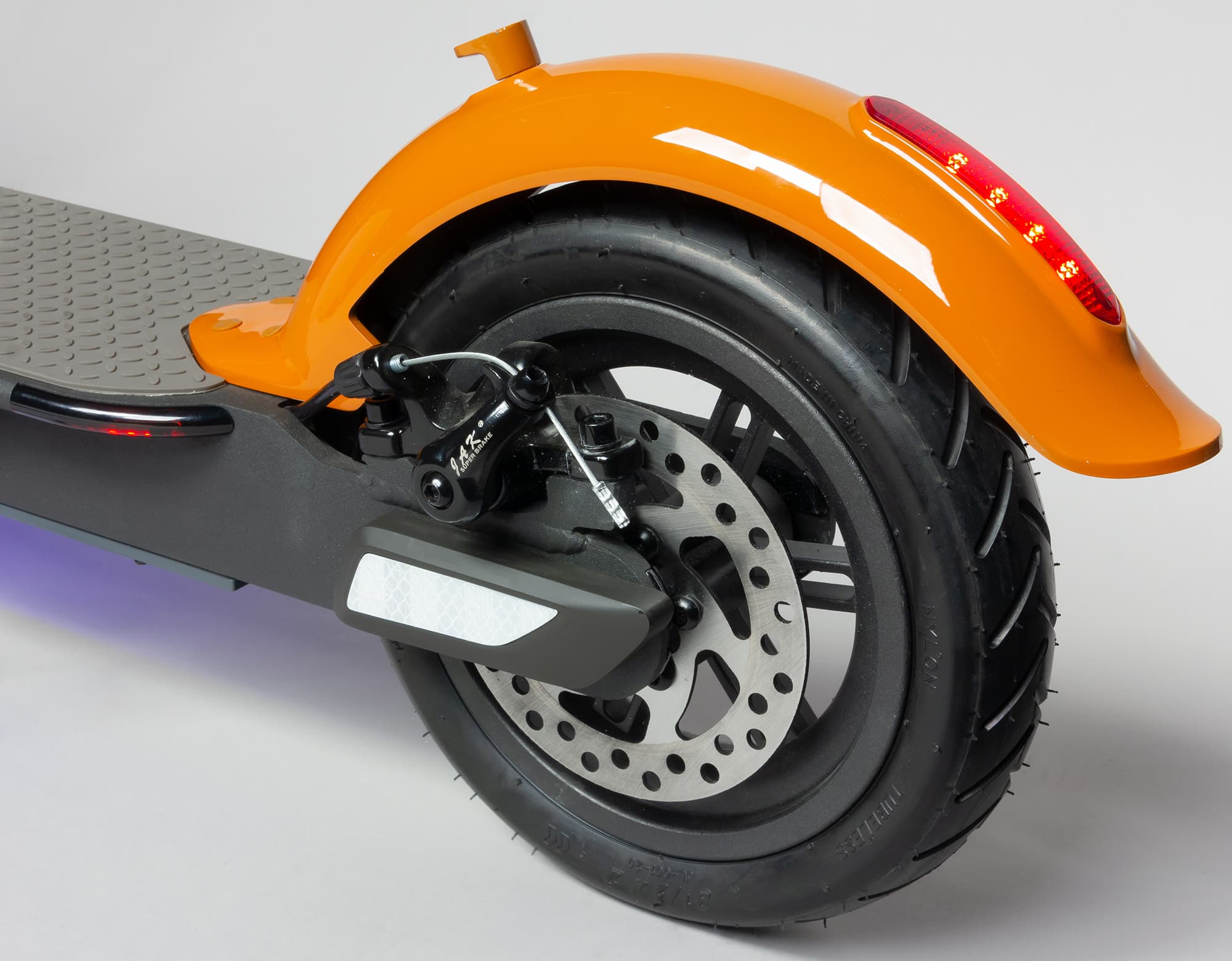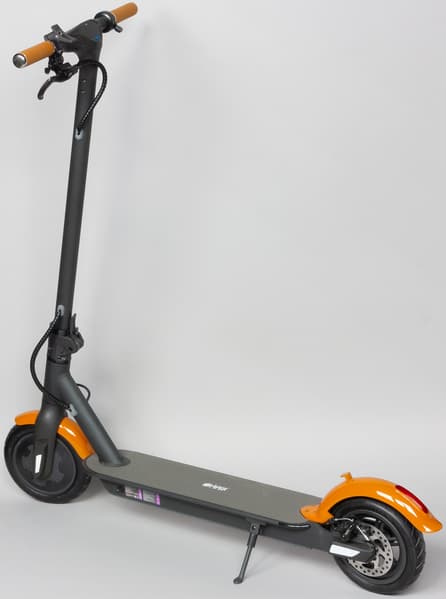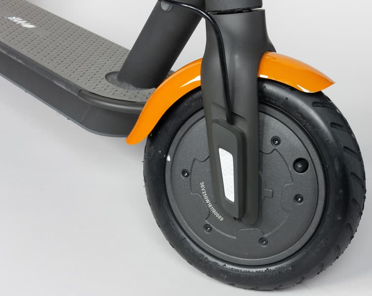 Самокат оборудован двумя 8,5-дюймовыми колесами с надувными шинами. На заднем колесе расположен дисковый тормоз.