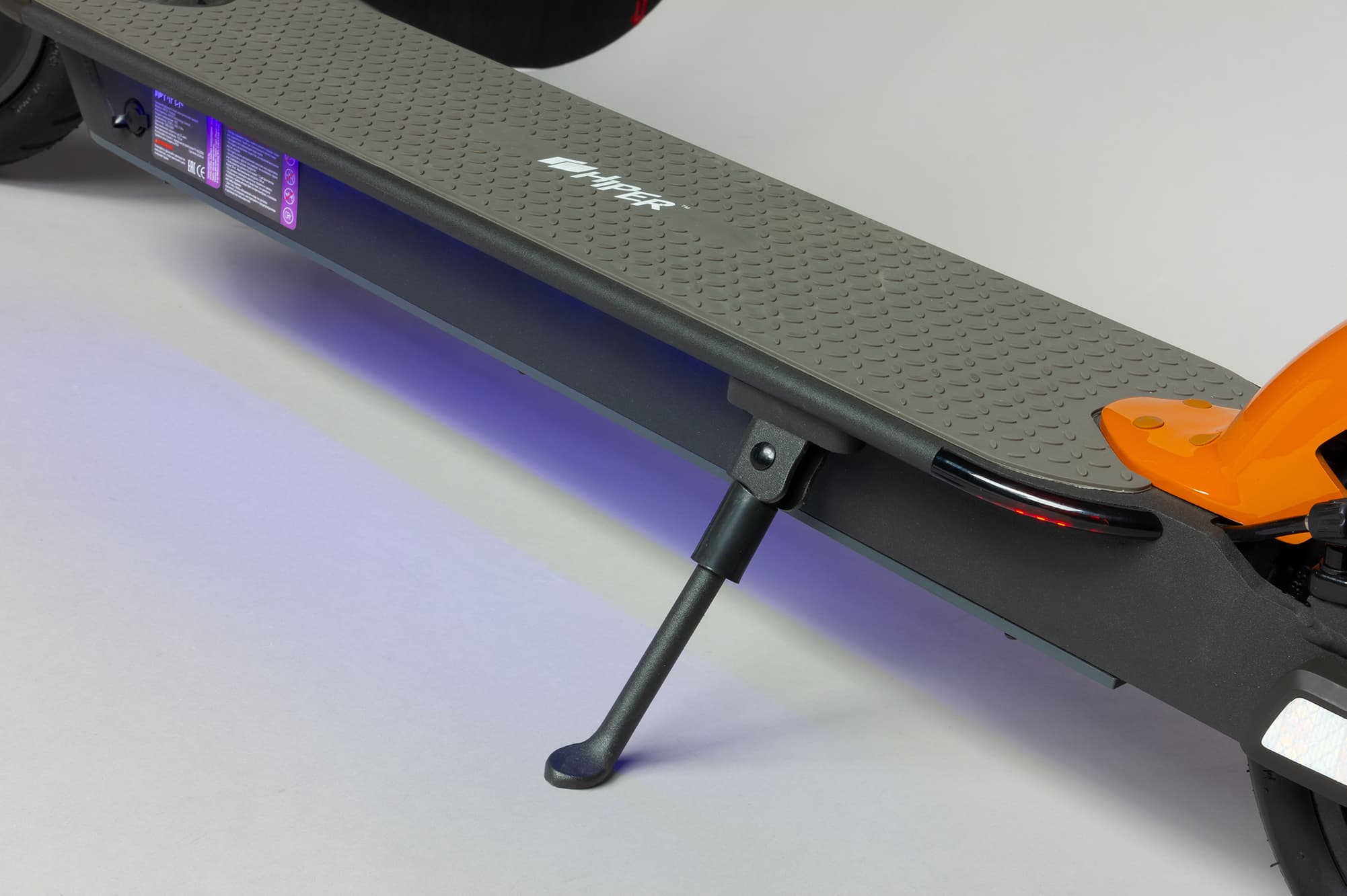 Платформа самоката широкая с резиновым гофрированным покрытием, ноги не скользят. По бокам платформы расположены светодиоды, которые обеспечивают видимость самоката на дороге в ночное время (при ярком солнечном свете они практически не видны). В платформе также находится блок питания устройства. Разъем для зарядки расположен в передней части платформы слева от руля и оснащен резиновой заглушкой.