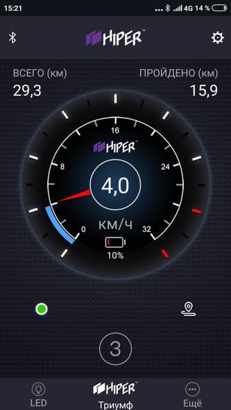 При помощи фирменного приложения к самокату можно подключить смартфон: становятся доступны настройки цвета и яркости подсветки, программное включение и выключение фары, отслеживание информации о зарядке (в процентах), скорости и пробеге устройства. Функция «заезд», позволяющая отслеживать маршрут и определять среднюю скорость и время перемещения, на тестах не заработала, однако производитель обещает исправить это в ближайшее время.
