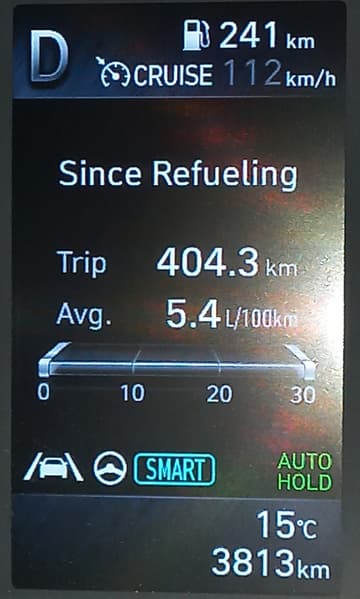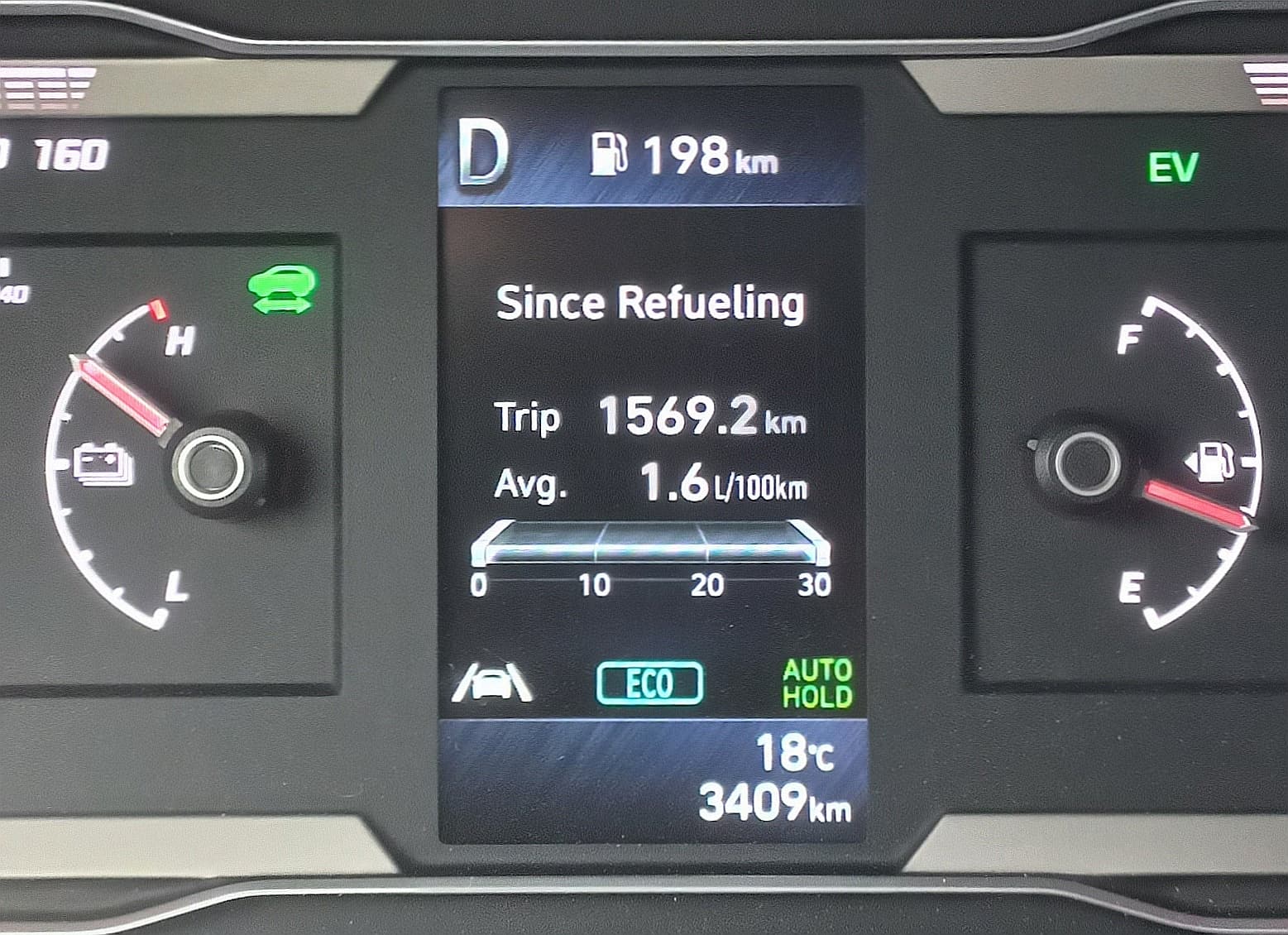 - Перед новой заправкой после этой поездки. Остаточный уровень заряда батареи — примерно 15%, заряд был выбран за первые 50 км путешествия, а далее использовался только гибридный режим. Заправлялся на обратном пути примерно в 100 км от дома. Надеялся, по старой памяти, что будет дешевле, чем на той заправке, что недалеко от дома. Зря надеялся.